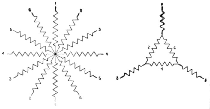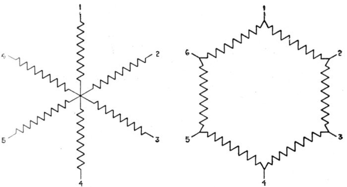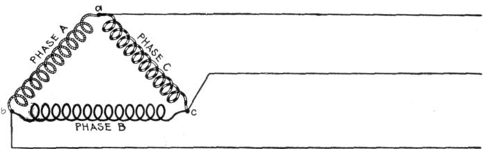 The delta connection gives a lower line voltage than the star[5] connection for the pressure generated per phase, and cuts down the current in the inductors; since the inductors, on this account, may be reduced in size, the delta connection is adapted to machines of large current output.