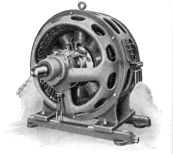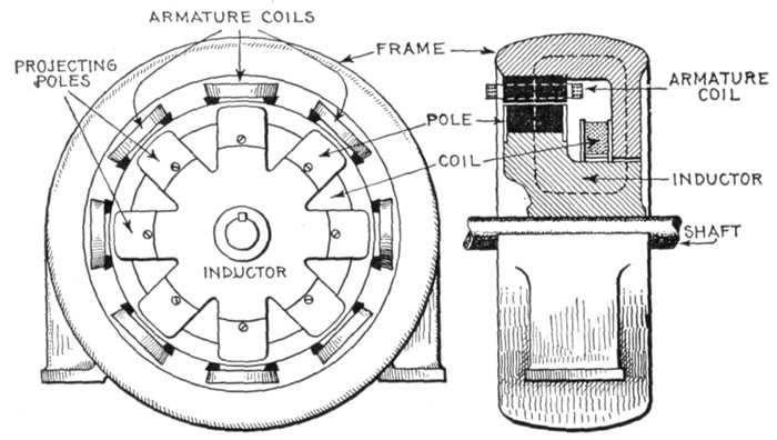 Thus, in an 8 pole machine, there will be four cycles per revolution. If the speed be 900 revolutions per minute, the frequency is