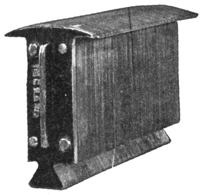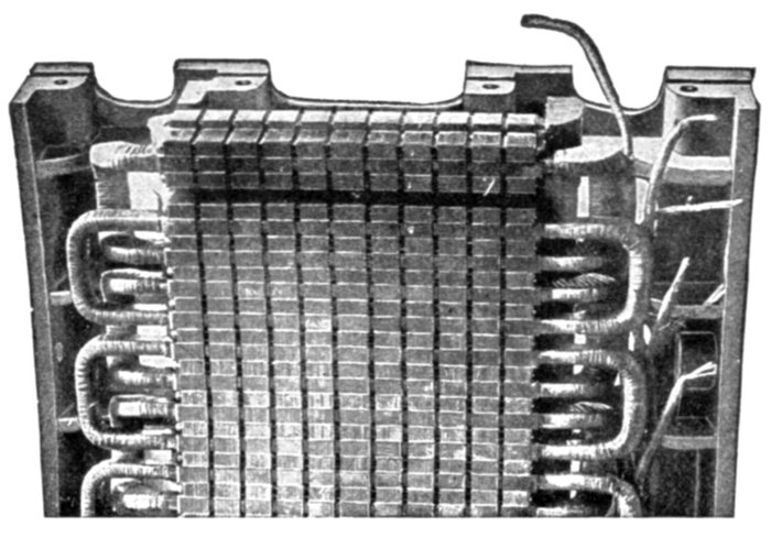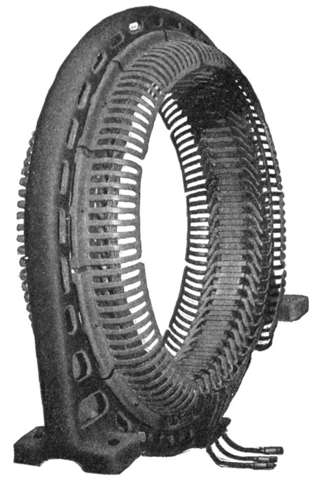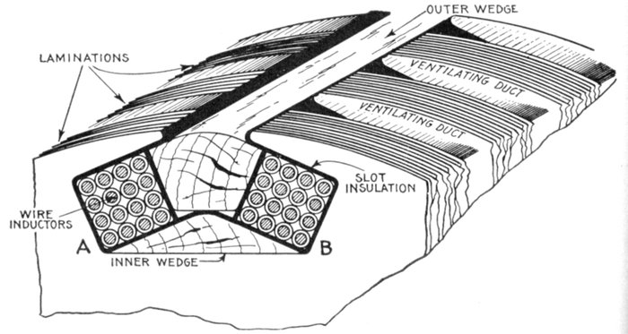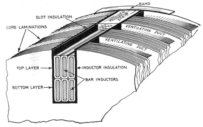Figs. 1,555 to 1,557.—Separate coils, and section of Allis-Chalmers alternator with coils in place. Numerous openings are provided in the frame through which air currents, set up by the revolving field, can pass freely and carry off heat. Shields are provided to protect the armature coils where they project beyond the core. In assembling the core spacing segments are placed at intervals to form ventilating ducts. After the coils have been covered with insulating materials and treated with insulating compound, the parts that are to lie in the slots are pressed to exact size in steam heated moulds. This runs the insulating material into all the small spaces in the coil so as to exclude moisture, it also makes the coil structure firm and solid. The projecting ends of the coils are heavily taped, suitable supports being provided for the coil connections so that they cannot become displaced on account of stresses due to short circuits or other causes. On high pressure machines the armature terminals are arranged so that it is impossible for an attendant to make accidental contact with them.