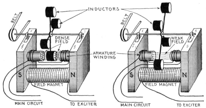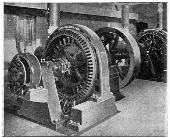 | Uses of alternators—classes of alternator—single phase alternators; essential features; width of armature coils—[Pg v]elementary single phase alternator—polyphase alternators—uses for two and three phase current—elementary three phase alternator—starting difficulty with single phase motors—six and twelve phase windings—belt or chain driven alternators—sub-base and ratchet device for tightening the belt—horse power transmitted by belts—best speeds for belts—advantages of chain drive; objections—direct connected alternator—"direct connected" and "direct coupled" units—revolving armature alternators; their uses—revolving field alternators—marine view showing that motion is purely a relative matter—essential parts of revolving field alternator—the terms "stator" and "rotor"—inductor alternators: classes, use, defects—hunting or surging in alternators—amortisseur windings—monocyclic alternators—diagram of connections—teaser coil—armature reaction—distortion of field—strengthening and weakening effects—superpositions of fields—three phase reactions—magnetic leakage—field excitation of alternators—self-excited alternator—direct connected exciter—gear driven exciters—slow speed alternators—fly wheel alternators—high speed alternators—water wheel alternators—construction of rotor—turbine driven alternators—construction—step bearing—alternators of exceptional character—asynchronous alternators—image current alternators—extra high frequency alternators—self-exciting image current alternators. | |