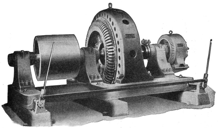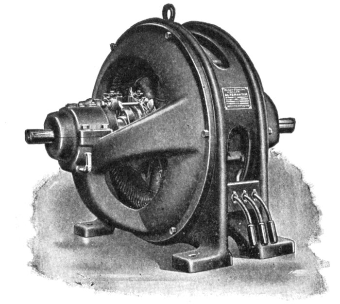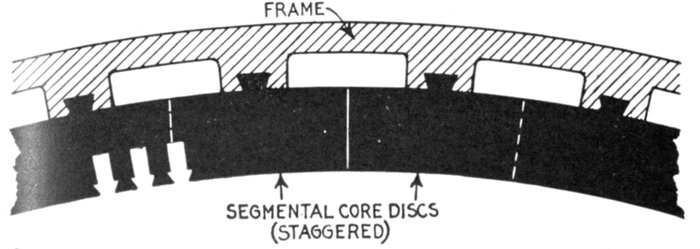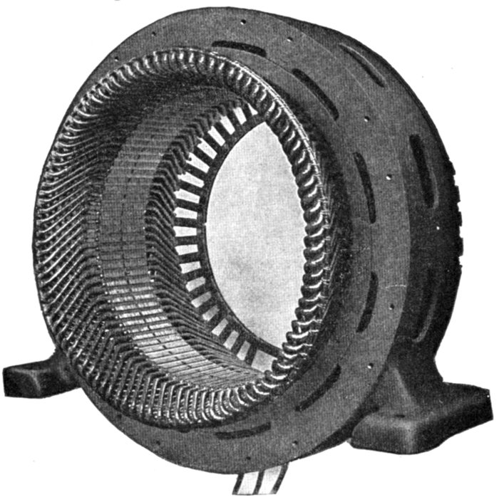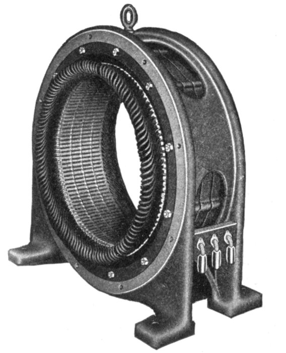 Fig. 1,570.—Frame and armature winding of Westinghouse pedestal bearing alternator. Armature frames are of cast iron and ventilated. Interior transverse ribs strengthen the frame and support the core laminations. The armature core is built up of annealed and japanned punched laminations. Armature slots are open. Armature coils are form wound, impregnated, and interchangeable; they are held in place with fiber wedges. Ventilating spaces are provided at intervals in the armature core and also between all coil ends.