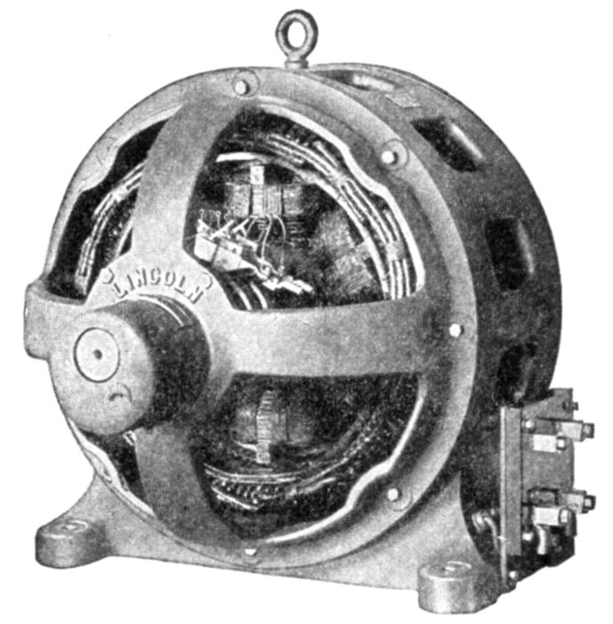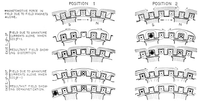 | Essential parts of an alternator—field magnets—methods of excitation: self-excited, separately excited, compositely excited—magneto—construction of stationary magnets—revolving field—slip rings—spider for large alternator—provision for shifting armature to give access to field—armatures—core construction—advantages of slotted core armatures—armature windings—classification: revolving and stationary windings—half coil and whole coil windings—concentrated or uni-coil winding; features; waveform—distributed or multi-coil windings: breadth of coil, partial and fully distributed coils—the Kapp coefficient—general equation for voltage—wire, strap, and bar windings—condition, governing type of inductor—coil covering—single and double layer multi-wire inductors and methods of placing them[Pg vi] on the core—insulation—core stamping—single and multi-slot windings—- arrangement in slot of two layer bar winding—table of relative effectiveness of windings—single phase windings—advantage of half coil winding—two phase windings—shape of coil ends—three phase windings—shape of coil ends—kind of coil used with three phase windings—grouping of phases—two phase star connection—two phase mesh connection—three phase star connection—winding diagrams with star and Δ connections—three phase Δ connection—three phase winding with "short" coils—three phase lap winding star connection—three phase wave winding star connection—output of star and delta connected alternators—gramme ring armatures showing three phase star and mesh connections with direction of currents in the coils—features of star connection—characteristics of delta connection—proper ends to connect to star point—determination of path and value of currents in delta connection—points to be noted with Y connection—diagram of Y connection with return wire—chain or basket winding—skew winding—fed-in winding—imbricated winding—spiral winding—mummified winding—shuttle winding—creeping winding—turbine alternator winding: how the high voltage is obtained with so few poles; table of frequency and revolutions—turbine alternator construction—form of armature generally used—two pole radial slot field—parallel slot field—difficulty experienced with revolving armatures—how the field design is modified to reduce centrifugal force—examples of revolving fields. | |