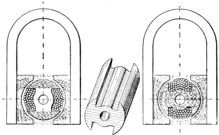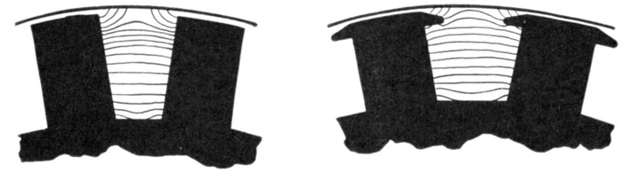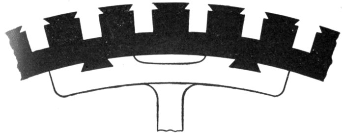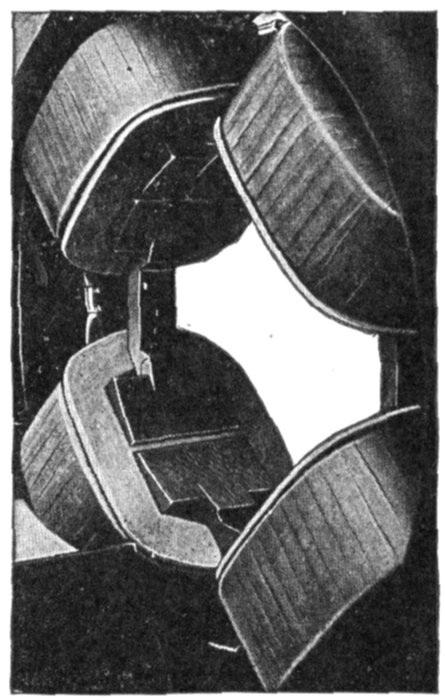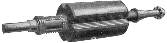 Fed-in Winding.—This name is given to a type of winding possible with open or only partially closed slots, in which coils previously formed are introduced, only a few inductors at a time if necessary. They are inserted into the slots from the top, the slot being provided with a lining of horn fibre or other suitable material, which is finally closed over and secured in place by means of a wedge, or by some other suitable means. An example of a fed-in winding is shown in figs. 1,566 and 1,568.