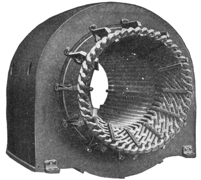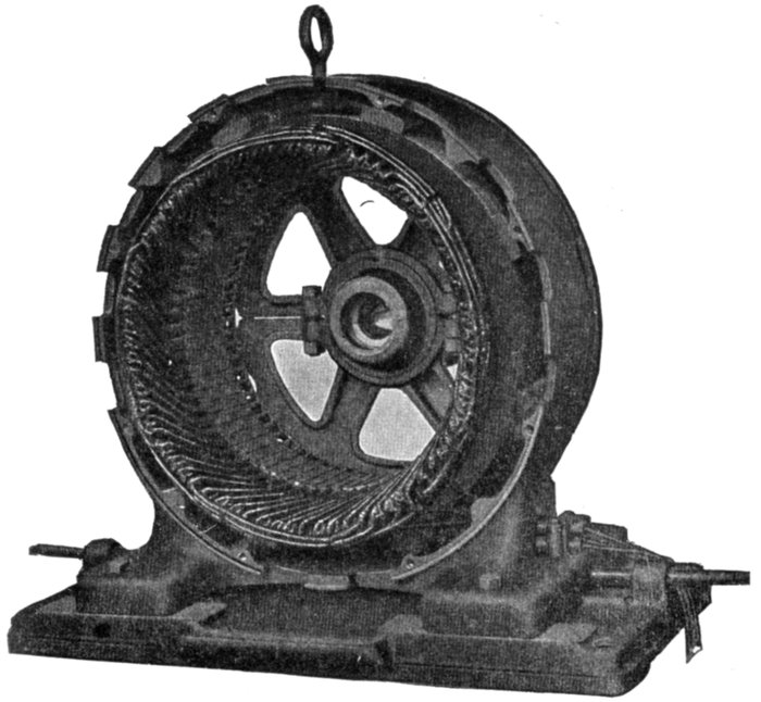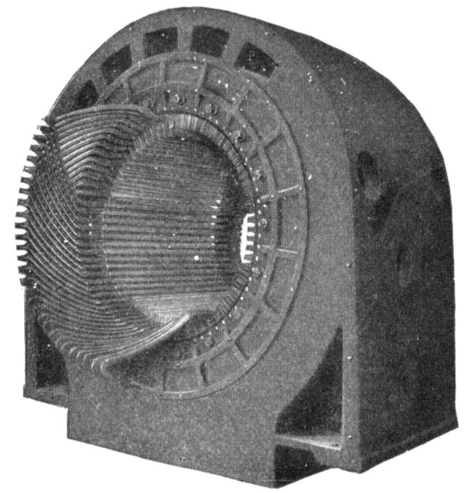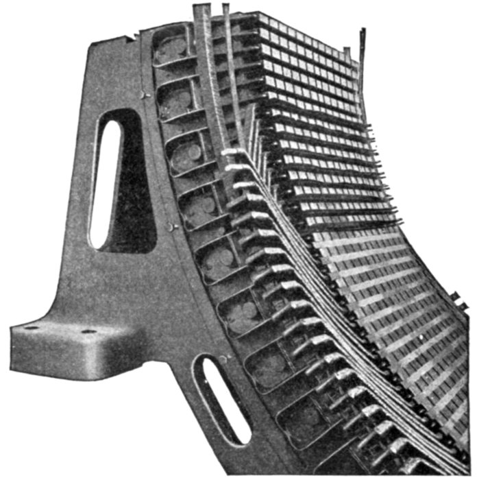 Fig. 1,578.—Stationary armature of Westinghouse turbine alternator with part of the winding in place. Because of the small number of coils in a turbine alternator as compared with a slow speed machine of the same kva. rating, each coil carries a great amount of power on large load, particularly at times of short circuits or grounds on the external circuit. The "throw" of the coils is large, leaving a considerable part of the winding in the end turns unsupported by the armature core. For these reasons great stresses, which are dangerous, if effective means be not adopted to withstand them, may exist between the coils. The inductors are of such cross section that they can be made rigid and insulated satisfactorily. The end turns are given a fan like form as shown, affording ventilation and effective bracing as shown in fig. 1,577. Cord lashings are, except in the smallest frames, used only for holding in the small spacing blocks between the coils. They are not depended on to support the coils. Malleable iron braces, hard maple blocks, and brass or steel bolts with brass washers are used to withstand the mechanical stresses imposed on the armature coils by external short circuits.