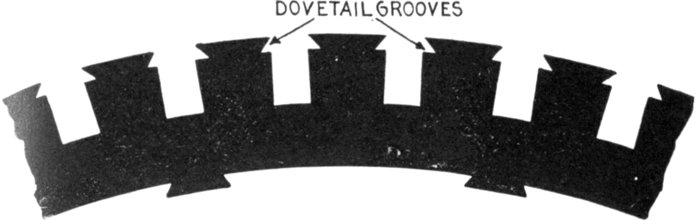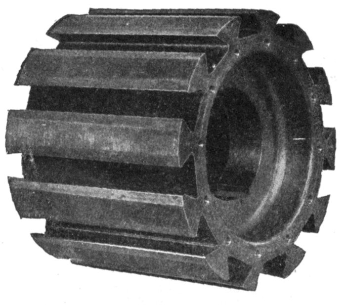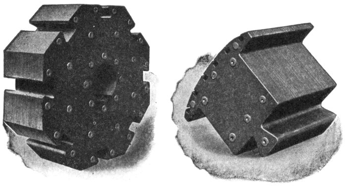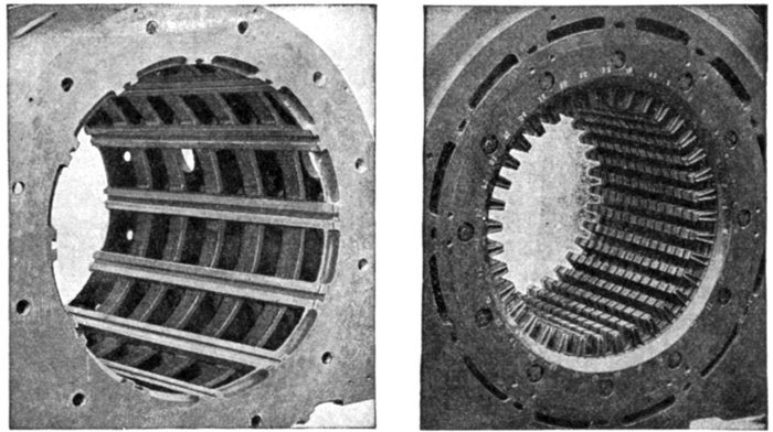 Figs. 1,575 and 1,576.—Westinghouse turbine alternator armature construction. Fig. 1,575. View showing dovetail grooves in armature casting; fig. 1,576, laminæ assembled in dovetail grooves of armature casting.