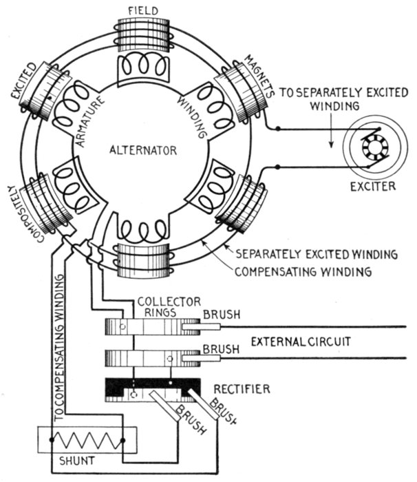 Fig. 1,559.—Diagram of Westinghouse three phase composite wound alternator. The armature inductors are of the closed coil or delta connected type, but are tapped at three points per pair or poles to the three collector rings. All three connections between the armature coils and the collector rings run through primary circuits of the series transformer within the armature, these three primaries each giving their own effect upon the secondary. Since the resultant of three equal alternating electromotive forces 120° apart is zero, so that some special arrangement must be adopted to make these electromotive forces act with instead of against each other. The arrangement is a reversal of the connections of one of the primaries of the series transformer. This is shown in the case of the lowest primary indicated in the diagram. The combination of the effects of the three primaries is again indicated in the small vector diagram in the upper right hand corner. Here OA is the effect of one primary, OB that of another ⅓ of a period displaced from the former in phase, and OC that which the third would exert were it not reversed, but the reversal brings the effect of this third coil into the phase relation OD, so that the three are only 60° apart. The combination of OA and OB is equal to OC, which combined again with OD gives a resultant effect, OE. In this case, as in the other, the effect upon the series field does not remain exactly proportional to the load unless the latter is balanced; in fact, an increased current through the one leg represented by OD, affects the series field as much as an equal increase in each of the other legs put together. Practically, however, any increase of the load—distributed as it must be in two legs at least—increases the field excitation so that proper regulation is secured.