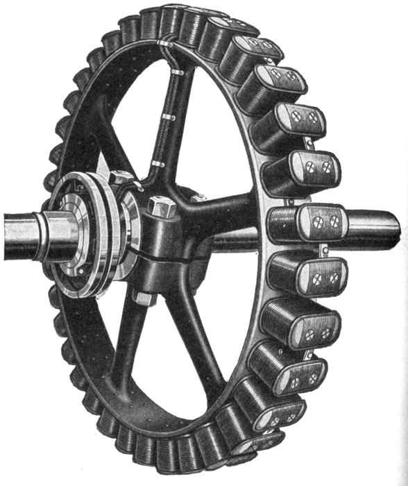 Fig. 1,579.—Two pole radial slot field. Radial slot fields are used on very small and very large alternators. The field diameters are so small that the end turns of the winding can be effectively bound into place, such binding being necessary with a radial slot machine. The shaft and disc are a one piece forging of steel.