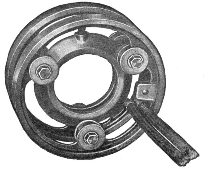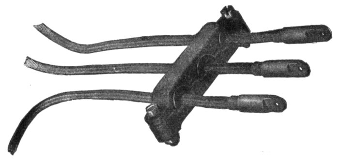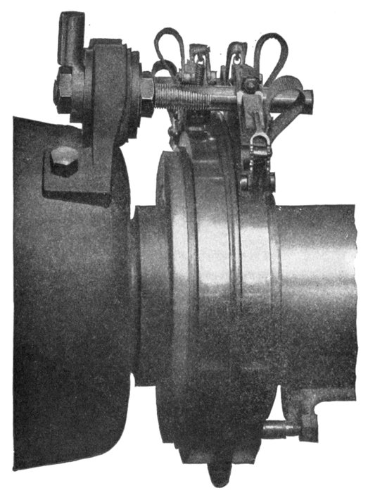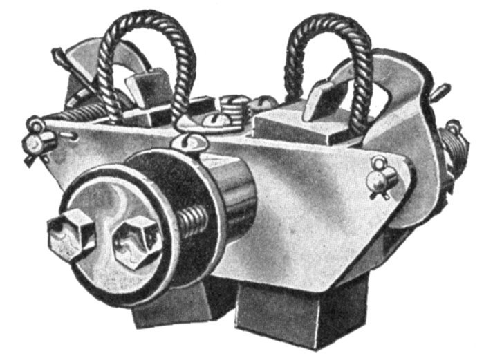 Fig. 1,561.—Triumph brushes and brush holder. The holder is of the box type provided with an adjustable tension spring, making the brushes self-feeding. Each holder is carried on insulated studs attached to a cast iron yoke which is mounted on the bearing.