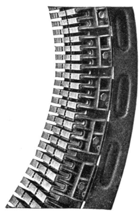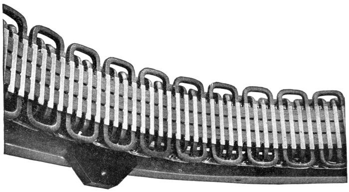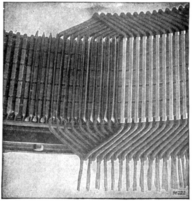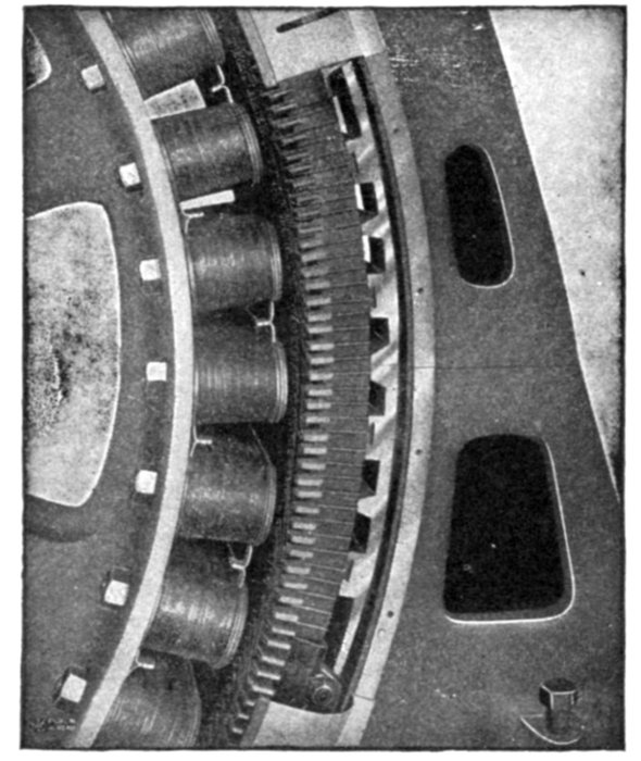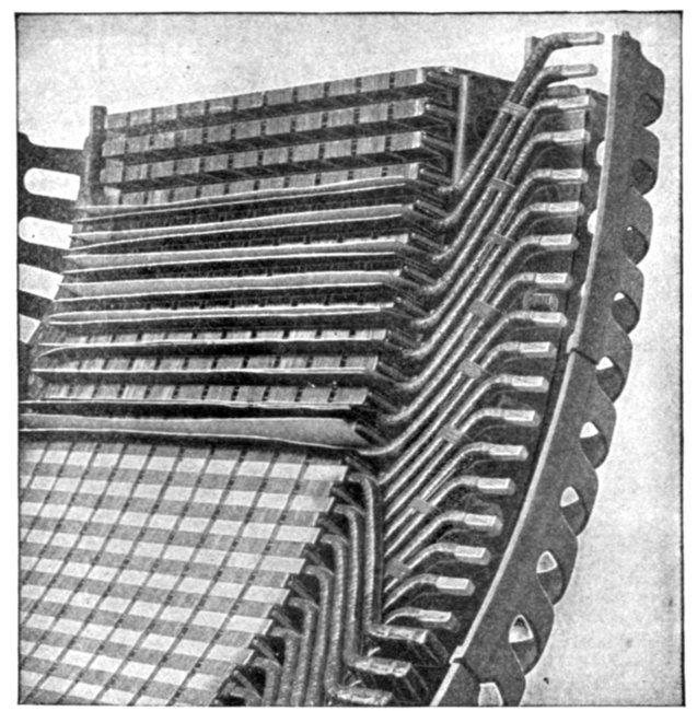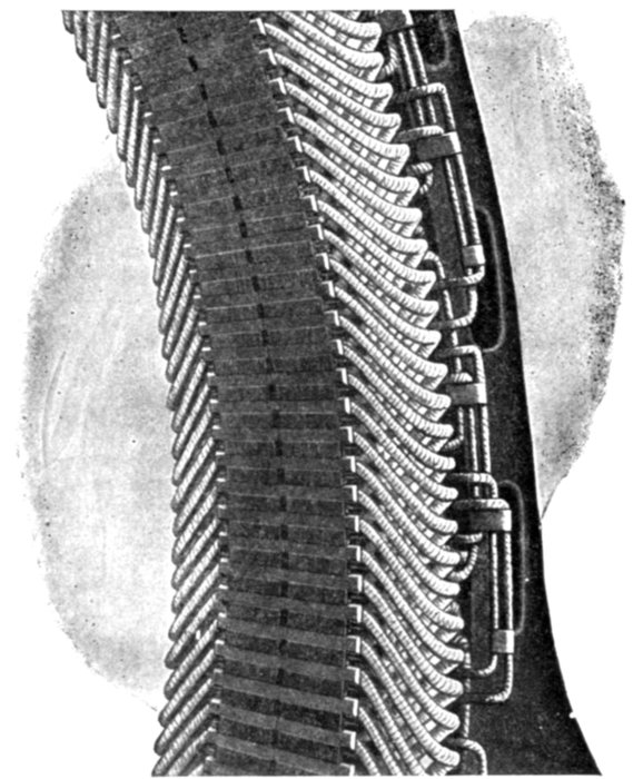 Fig. 1,565.—Section of armature winding of Allis-Chalmers 500 kw. three phase water wheel alternator. The coils are of the concentrated "half" type. Each coil is completely insulated before being placed on the core and no insulation is placed in the slot itself. The ends of the coils where they project beyond the slots are heavily taped. Where necessary suitable supports are provided for the coil connections so that they cannot become displaced on account of stresses due to short circuits or other causes. The winding is of the "chain" type. This is shown by the way the coils are connected together at the right. The armature terminals are either provided with insulated connectors or are led to a marble terminal board on which the terminals are so mounted and protected that it is impossible for an attendant to make accidental contact with them. The position of the illustration would indicate a horizontal alternator but the machine is of the vertical type; the lug on the right shows this, being used for adjusting the alternator on the foundation.