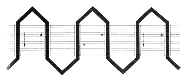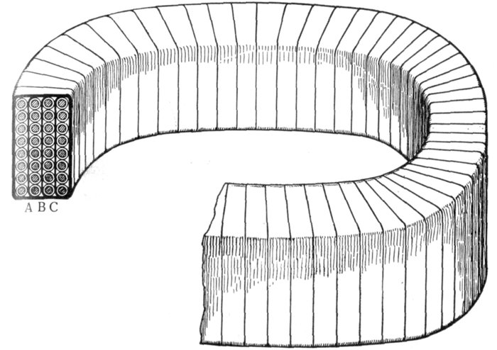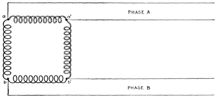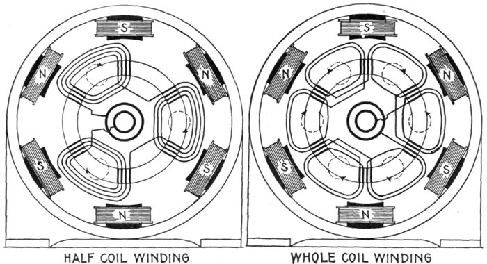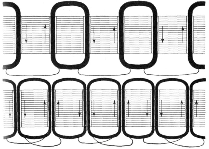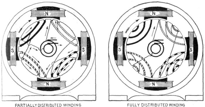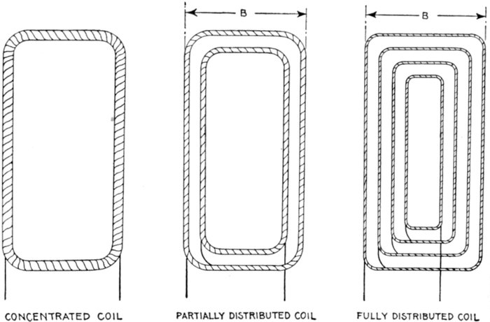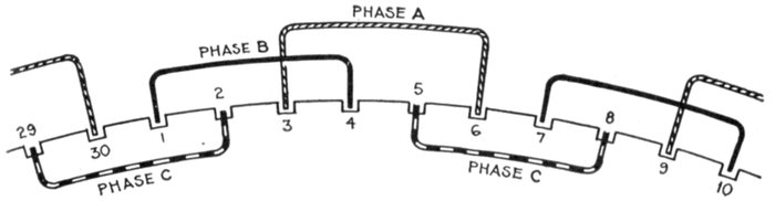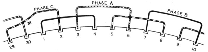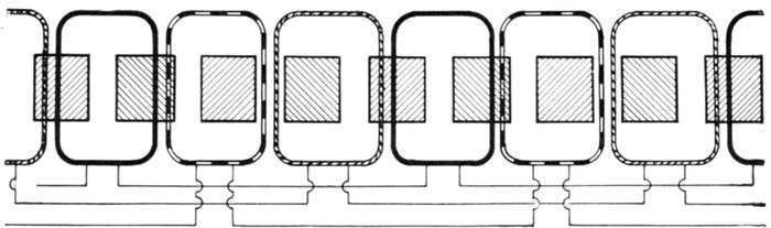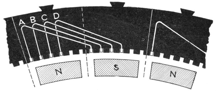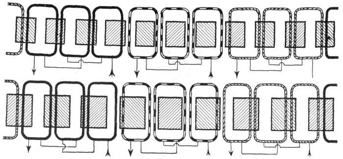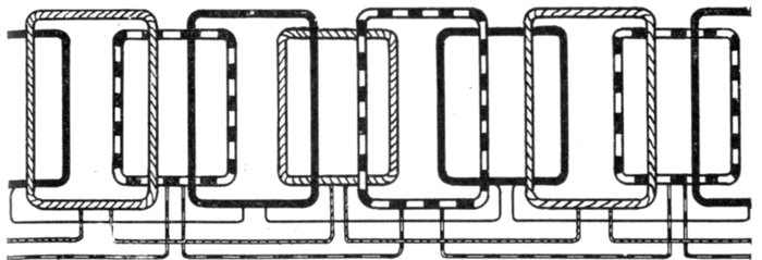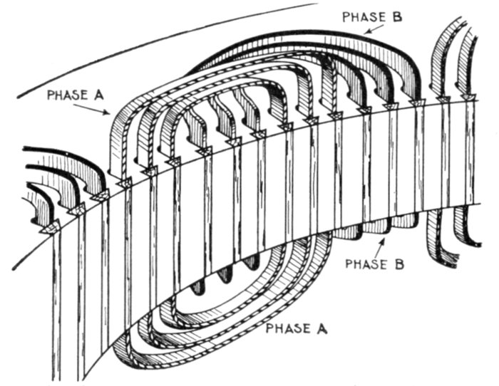 In chain winding the adjacent coils link one another as in a chain (hence, the name); the winding is similar to a skew coil[Pg 1257] winding. This plan of winding is supposed to have some advantage in keeping coils of different phases further separated than the two range plan.