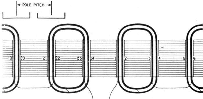 If three adjacent coils, each having a pitch of 120 electrical degrees, be set side by side, they will occupy the same breadth as 4 poles, and, by repetition, will serve for any machine having a multiple of 4 poles, but cannot be used for machines with 6, 10 or 14 poles. Fig. 1,571 shows this example.
