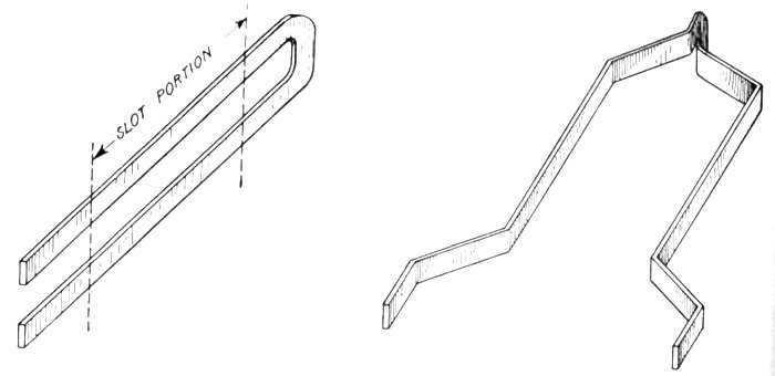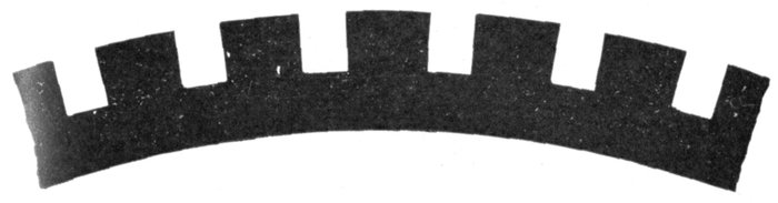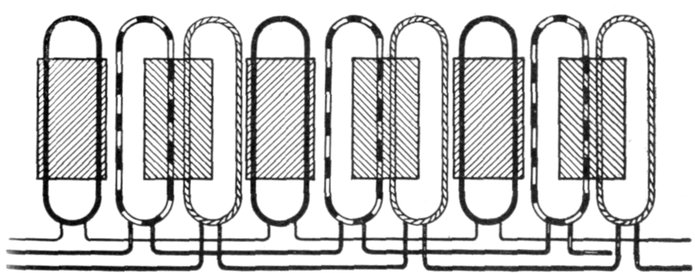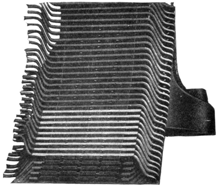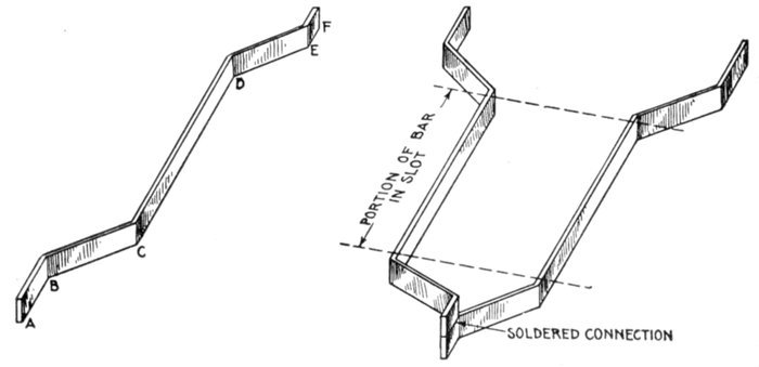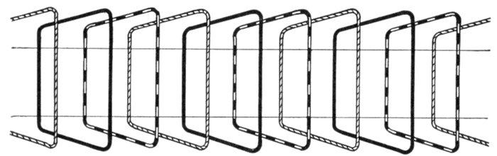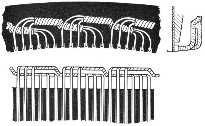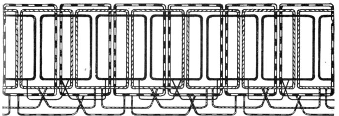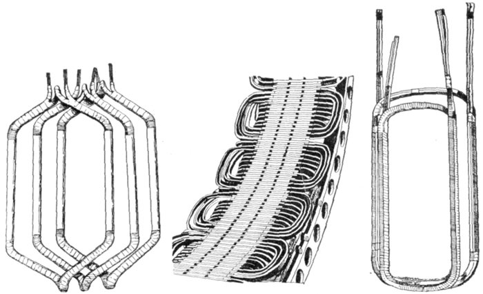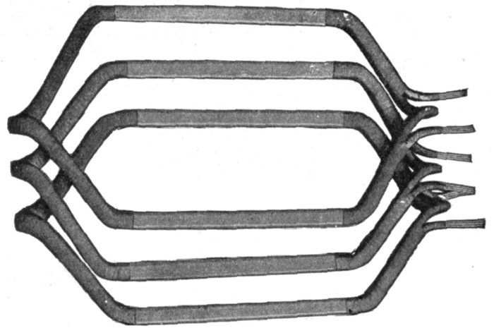 Chain or Basket Winding.—One disadvantage in ordinary two-range windings is that two or three separate shapes of coil are required. The cost of making, winding, and supplying spares would be less if one shape of coil could be made to do for all phases. One way of accomplishing this is by the method of chain winding, in which the two sides of each coil are made of different lengths, as shown in fig. 1,563, and bent so that they can lie behind one another.