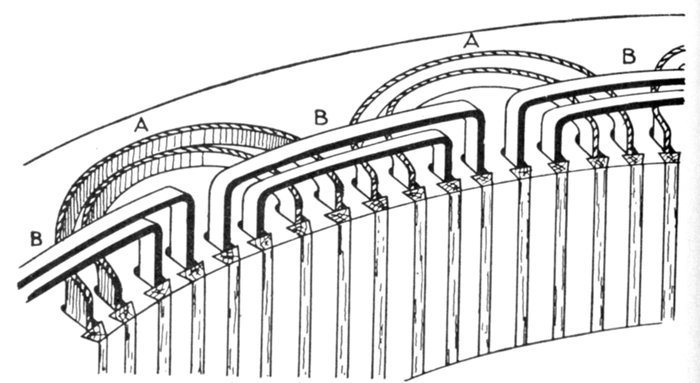 The winding is used especially on the armatures of turbine alternators and dynamos.