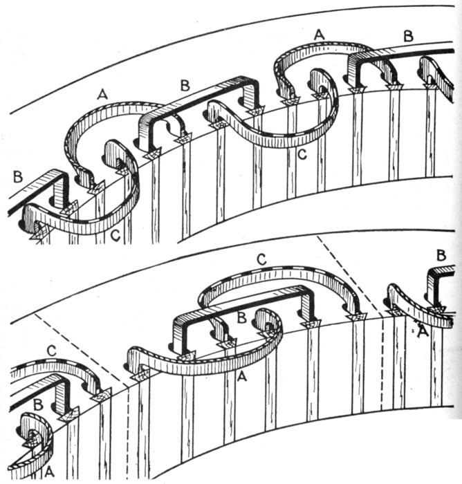 Fig. 1,563.—Diagram showing chain winding. In this method of winding the coils are all similar with long and short sides. It obviates the extra cost of making coils of several different shapes. The diagram represents a winding for one slot per pole per phase.