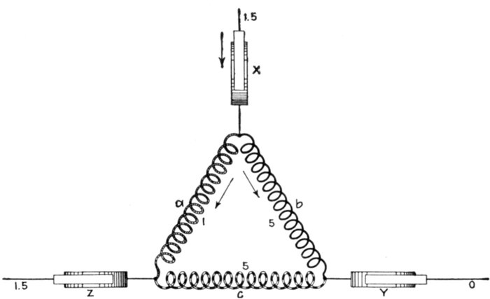 Ans. Starting with the inductors of one phase opposite the middle of the poles, assume the maximum current to be induced[Pg 1254] at this moment; then but one-half of the same value of current will be induced at the same moment in the other two phases, and its path and value will best be shown by aid of fig. 1,560, in which X may be taken as the middle collector ring, and the maximum current to be flowing from X toward Z. It will be seen that no current is coming in through the line Y, but part of the current at Z will have been induced in the branches b and c.