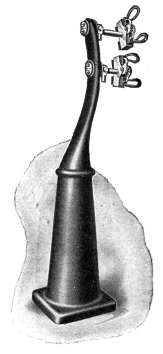 Fig. 1,574.—Triumph pedestal and brush rigging for large revolving field alternators. Carbon brushes are used, carried in box type brush holders. The stand or pedestal here shown is the kind used with the engine and fly wheel types of alternator. The brush studs are mounted on the stand in such a manner that the brushes are easily accessible. The latter carry only the low voltage direct current necessary for exciting the field.