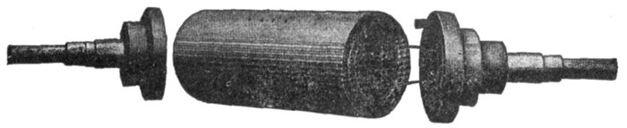 Figs. 1,580 to 1,582.—Westinghouse two pole parallel slot field with ends removed showing construction. The parallel slot design of field construction is used in Westinghouse machines up to 10,000 kva. capacity. In fig. 1,581, the large holes at the end near the circumference of the cylinder are for the accommodation of the bolts that hold the bronze end discs and stub shafts. In winding, the cylinder is mounted on a horizontal turntable that rotates in a horizontal plane. The copper strap field coil winding is wound turn by turn under pressure and strip insulation is wound in between. When completed the turns are held rigidly in position with heavy brass wedges. An end disc made of bronze holds the stub shaft and is bolted to each end of the steel center. When the leads are attached to the collector rings the field is complete.