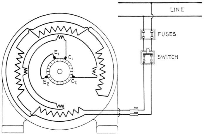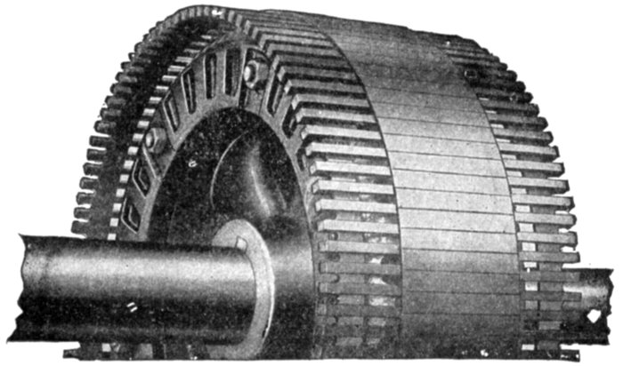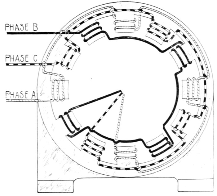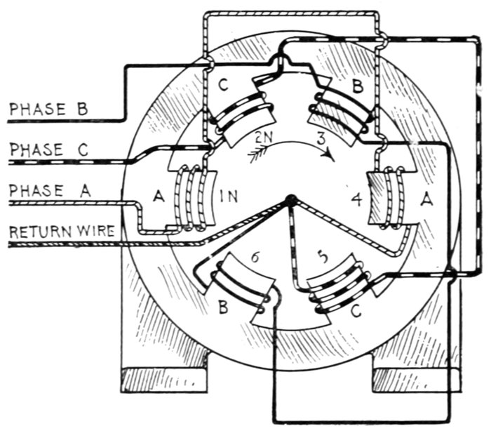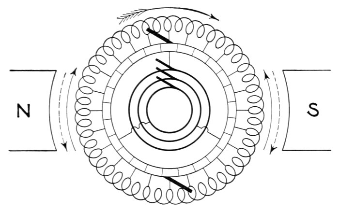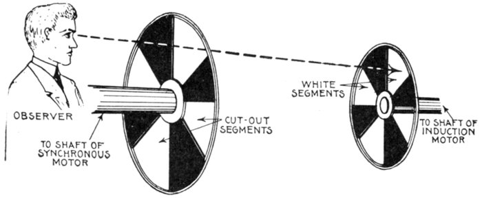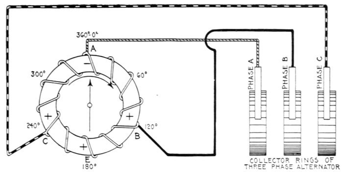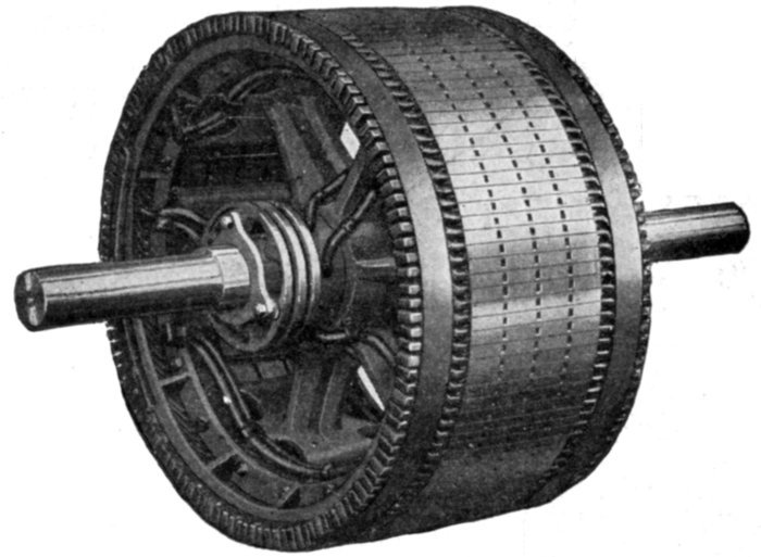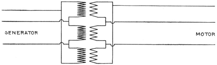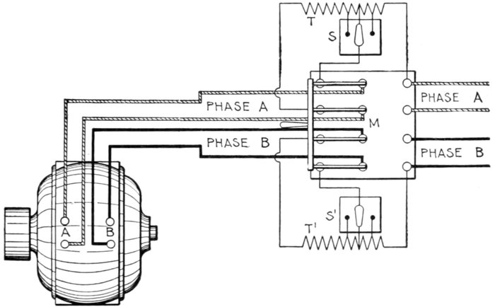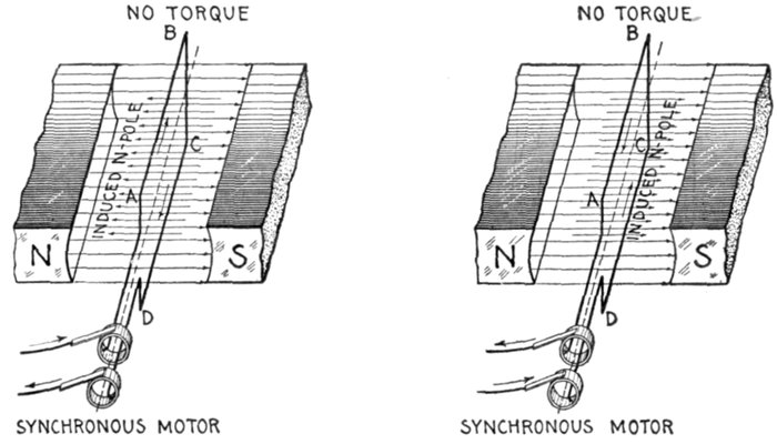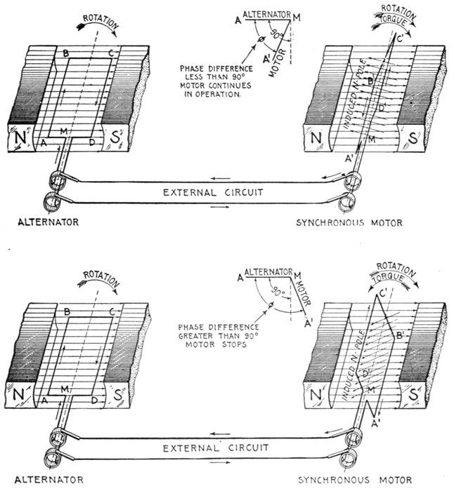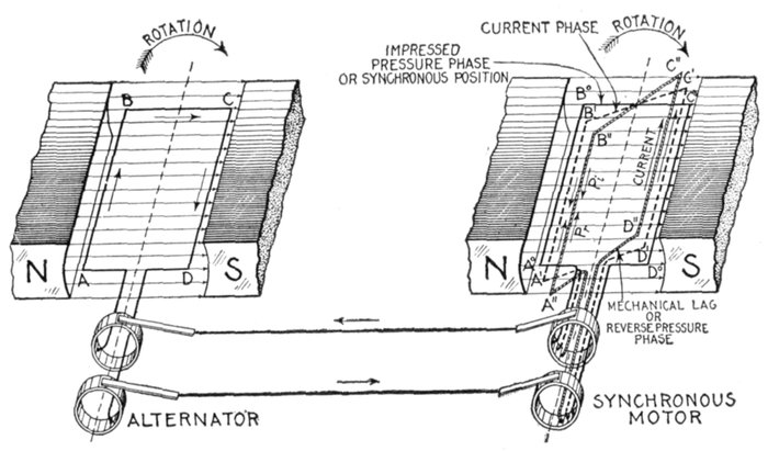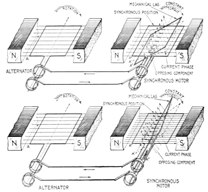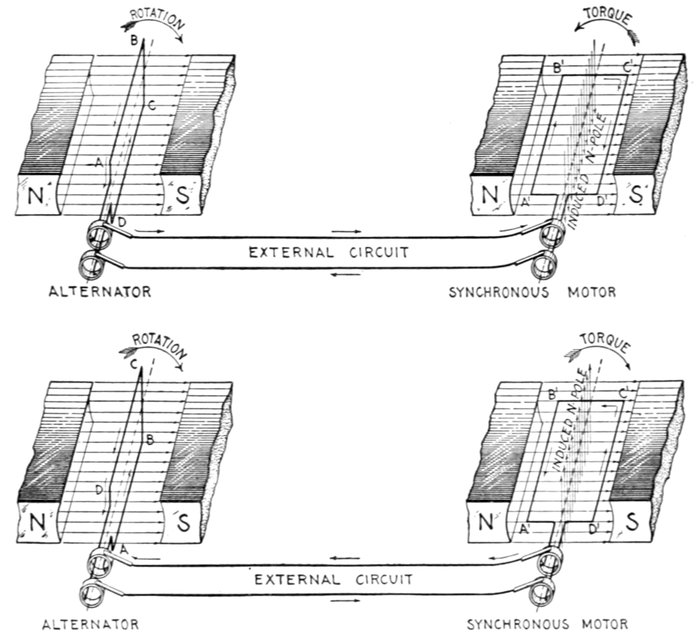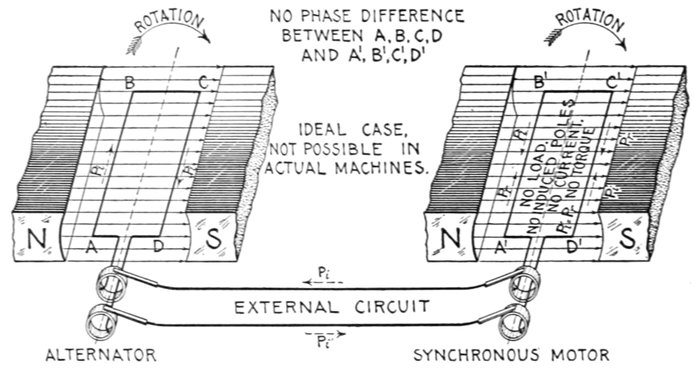 Now if the motor armature be first brought up to a speed corresponding in frequency to that of the alternator before connecting the motor[Pg 1274] in the circuit, the armature will continue revolving at the same frequency as the alternator.