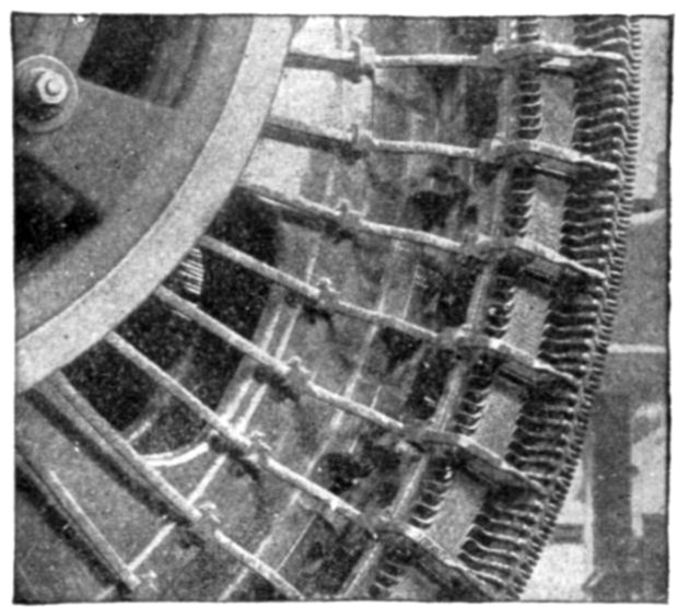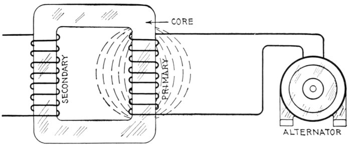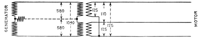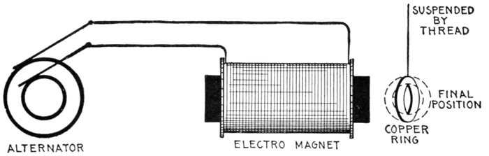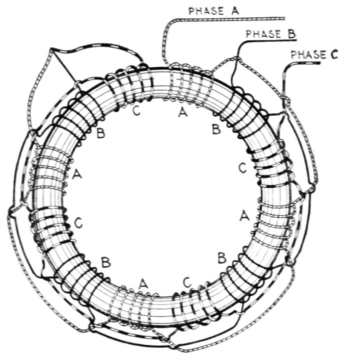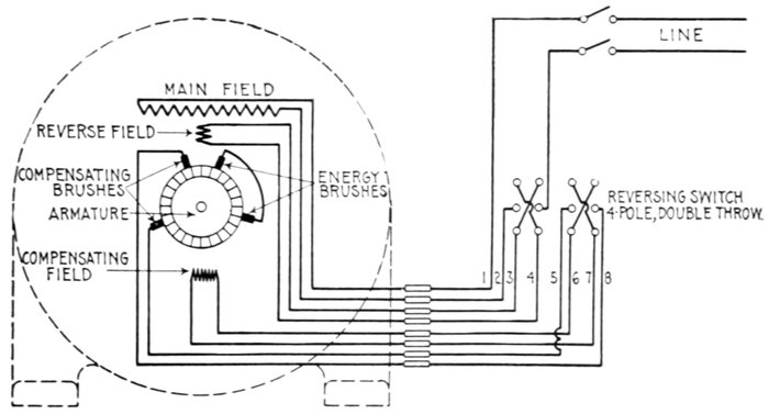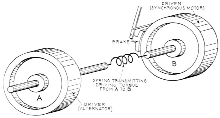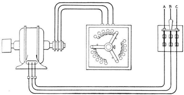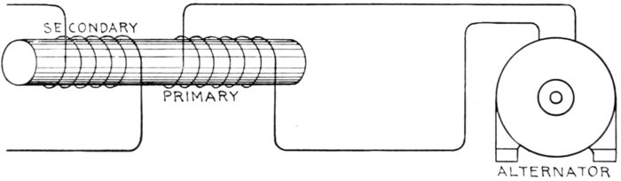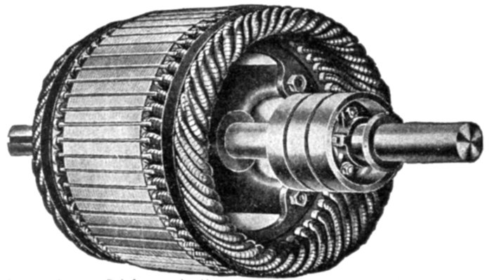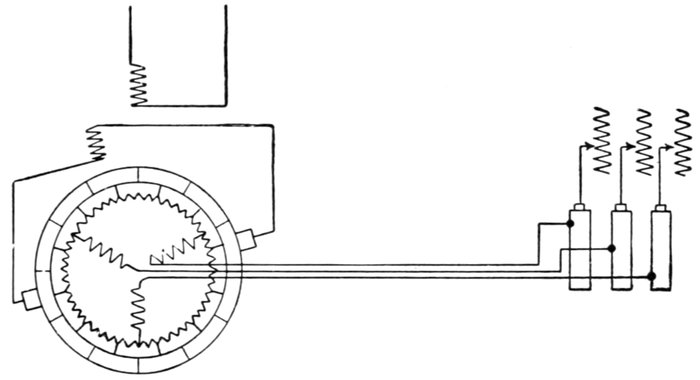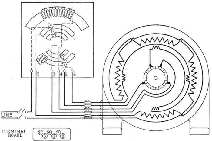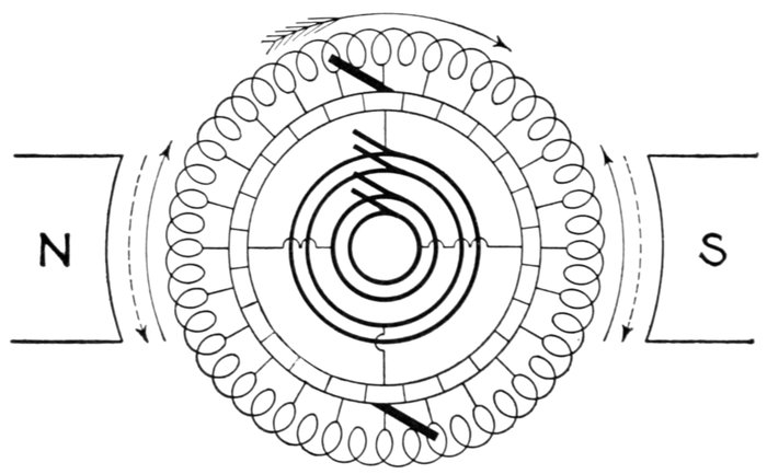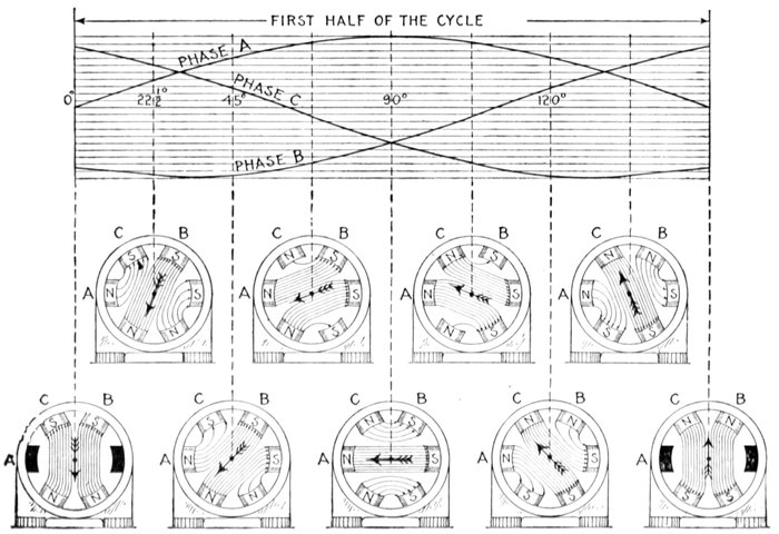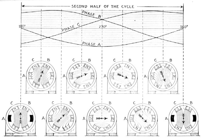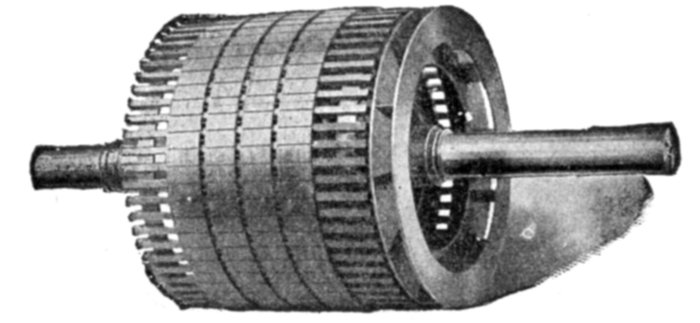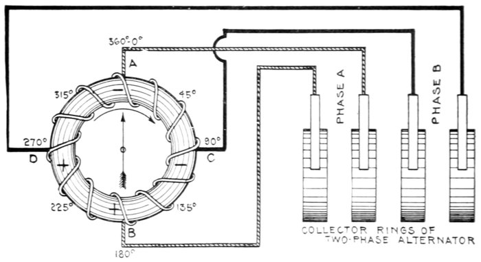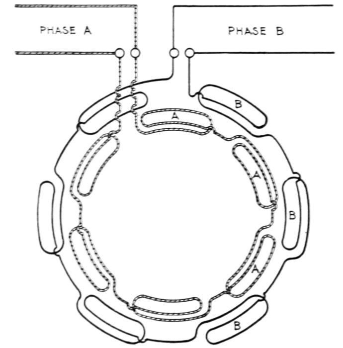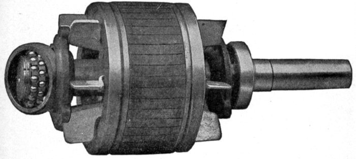 Now if the motor armature be first brought up to a speed corresponding in frequency to that of the alternator before connecting the motor[Pg 1274] in the circuit, the armature will continue revolving at the same frequency as the alternator.