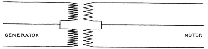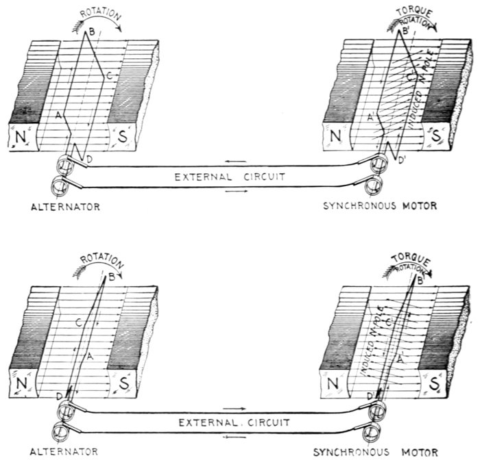 The principles upon which such motors operate may be explained by considering the action of two elementary alternators connected in circuit, as illustrated in the accompanying illustrations, one alternator being used as a generator and the other as a synchronous motor.