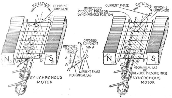 Figs. 1,595 and 1,596.—Synchronous motor principles: IV—A synchronous motor adjusts itself to changes of load by changing the phase difference between current and pressure. If there be no load and no friction, the motor when speeded up and connected in the circuit, will run in true synchronism with the alternator, that is, at any instant, the coils A B C D and A°B°C°D° will be in parallel planes. When this condition obtains, no current will flow and no torque will be required (as explained in figs. 1,593 and 1,594). If a load be put on the motor, the effect will be to cause A°B°C°D° to lag behind the alternator coil to some position A"B"C"D" and current to flow. The reverse pressure will lag behind the impressed pressure equally with the coil, and the current which has now started will ordinarily take an intermediate phase so that it is behind the impressed pressure but in advance of the reverse pressure. These phase relations may be represented in the figure by the armature positions shown, viz.: 1, the synchronous position A°B°C°D° representing the impressed pressure, 2, the intermediate position A'B'C'D', the current, 3, the actual position A"B"C"D" (corresponding to mechanical lag), the reverse pressure. From the figure it will be seen that the current phase represented by A'B'C'D' is in advance of the reverse pressure phase represented by A"B"C"D". Hence, by armature reaction, the current leading the reverse pressure weakens the motor field and reduces the reverse pressure, thus establishing equilibrium between current and load. As the load is increased, the mechanical lag of the alternator coil becomes greater and likewise the current lead with respect to the reverse pressure, which intensifies the armature reaction and allows more current to flow. In this way equilibrium is maintained for variations in load within the limits of zero and 90° mechanical lag. The effect of armature reaction on motors is just the reverse to its effect on alternators, which results in marked automatic adjustment between the machines especially when a single motor is operated from an alternator of about the same size. In other words, the current which weakens or strengthens the motor field, strengthens or weakens respectively the alternator field as the load is varied.