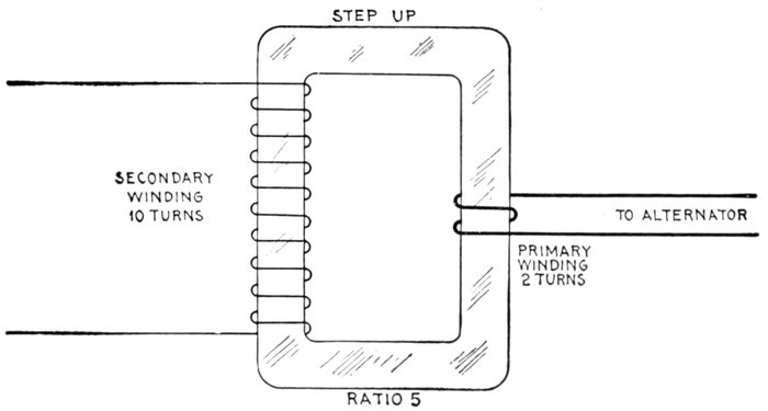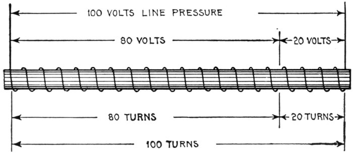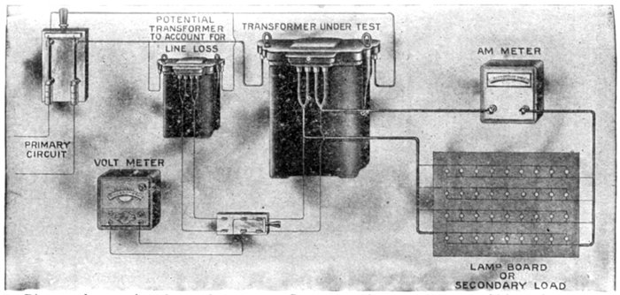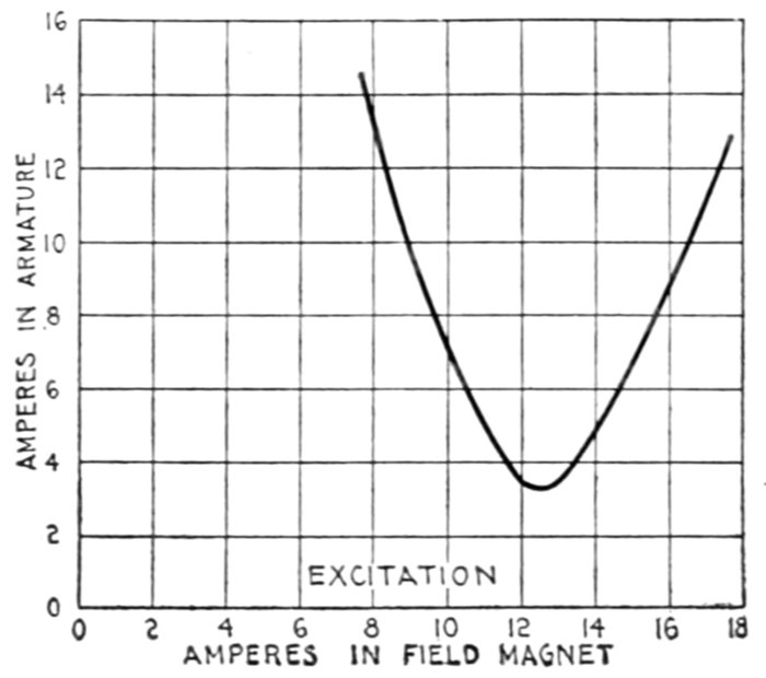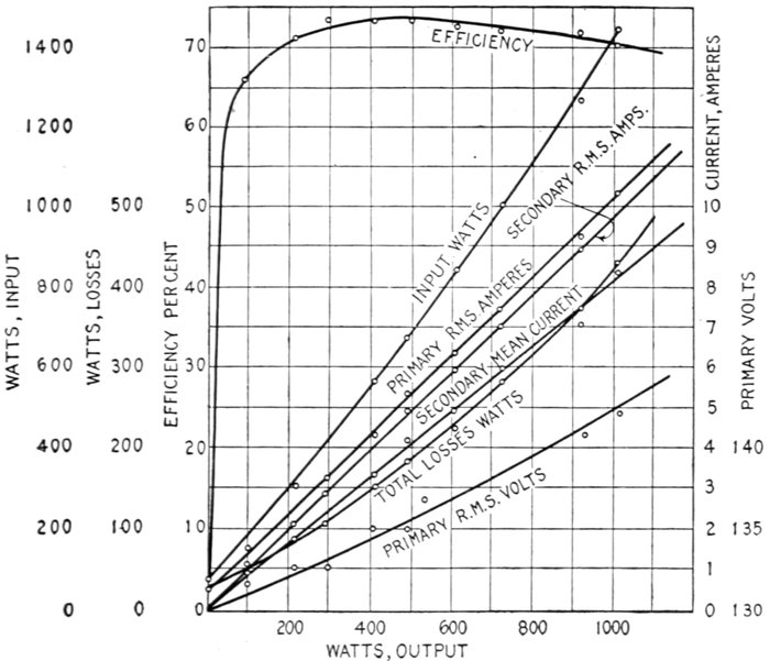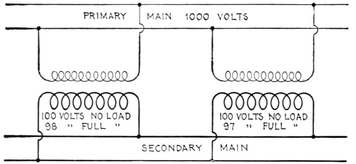 Ans. A reverse pressure of approximately 14 volts is produced, which remains nearly constant through changes of load,[Pg 1526] frequency, and voltage. Its effect is to decrease the commercial efficiency slightly on light loads.