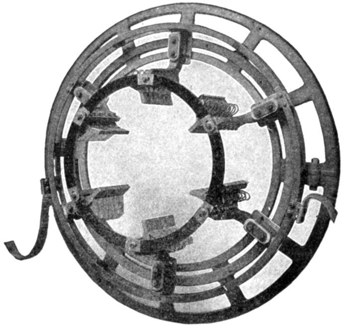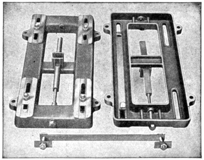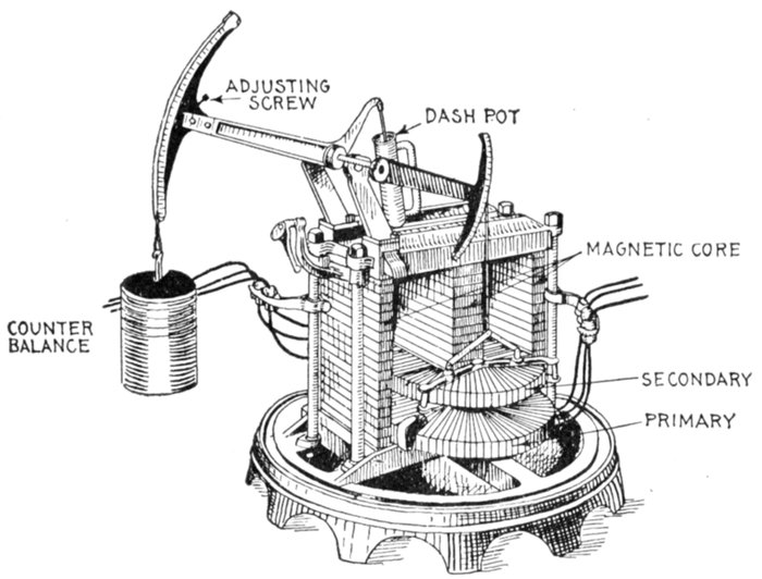 When the alternating current circuit is broken, the springs SP, SP, carried by SB and bearing against the adjustable studs, keep SB, CS and CS'. The apparatus thus acts also as a no voltage circuit breaker, for should the supply fail, the storage battery A' under charge will be left on open circuit.