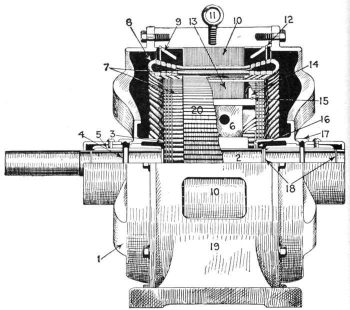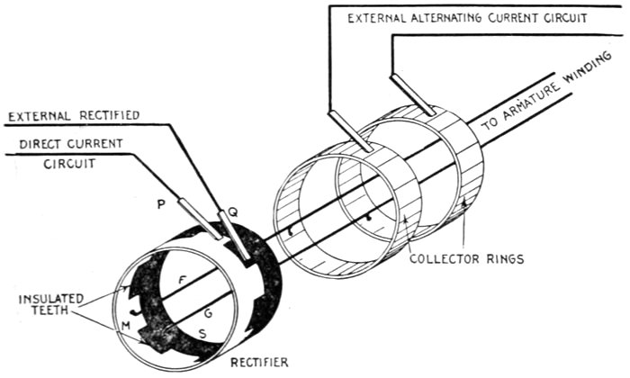 Fig. 2,121.—Diagram showing essential features of Premier Ampero electromagnetic rectifier. Details of construction and principles of operation are given in the accompanying text.