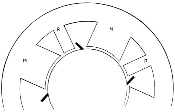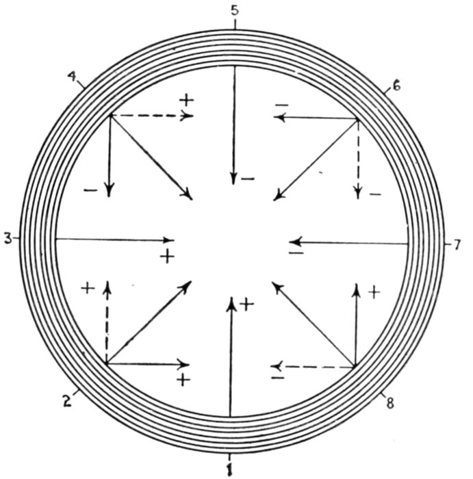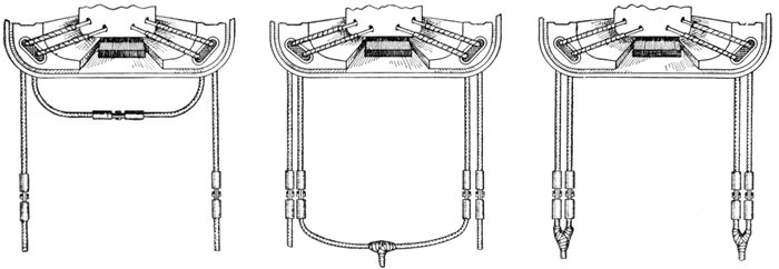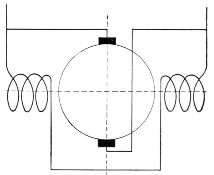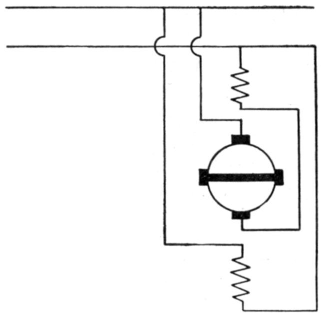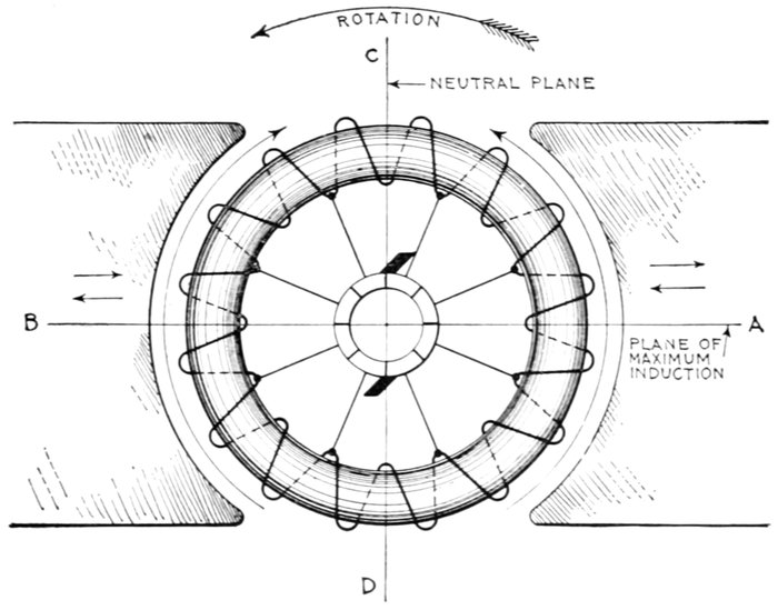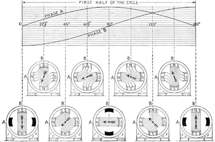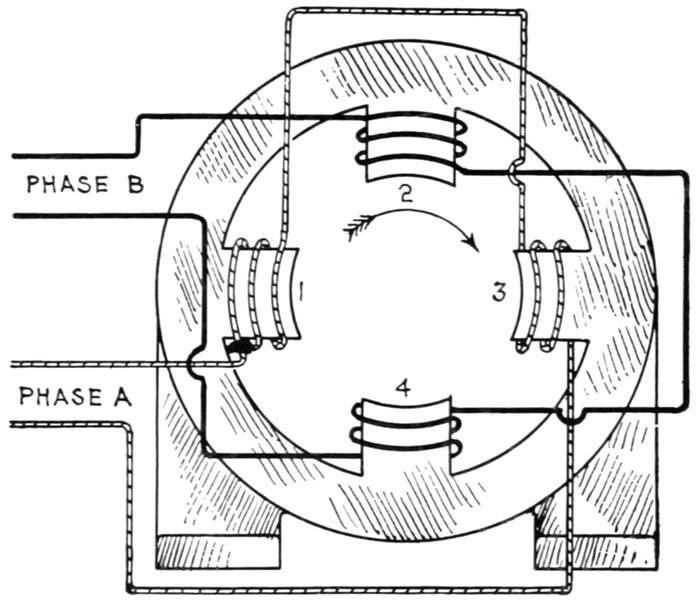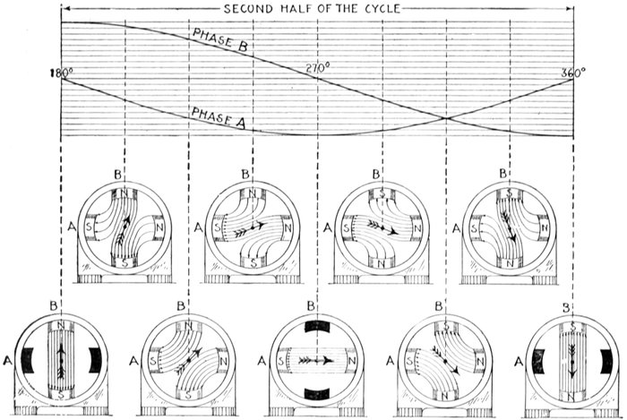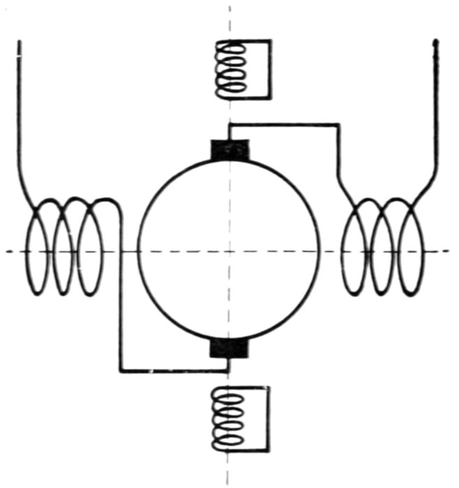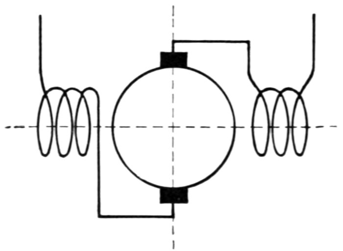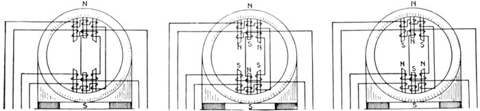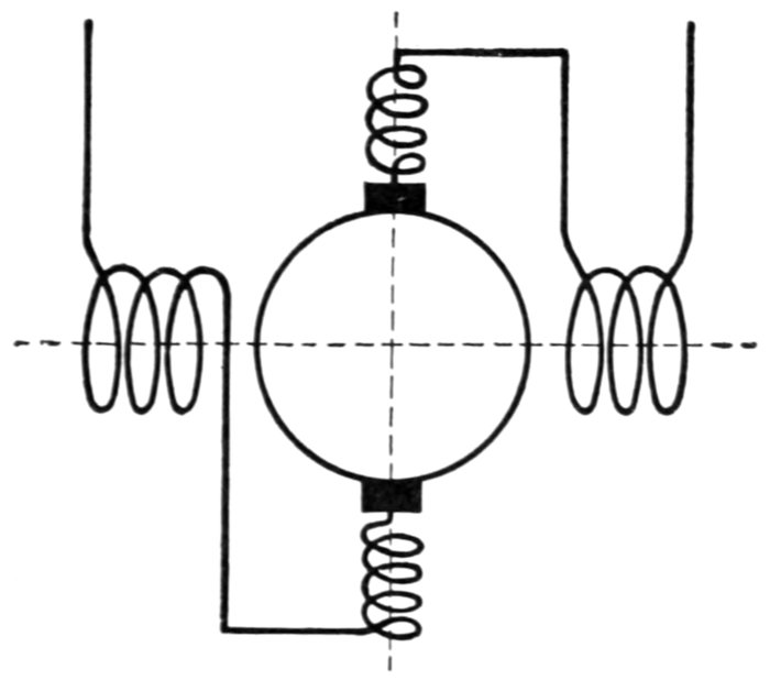 Suppose the motor, as in figs. 1,585 and 1,586, be at rest when[Pg 1272] it is connected in circuit with the alternator. The alternating current will flow through the motor armature and produce a reaction upon the field tending to rotate the motor armature first in one direction, then in another.