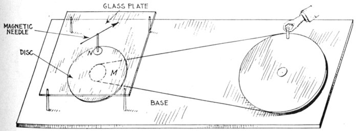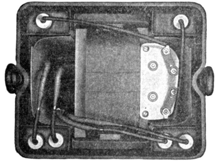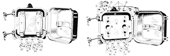 Fig. 2,121 is a combined sketch and diagram of connections of a type of electromagnetic rectifier that has been introduced for changing alternating into direct current. The actual apparatus consists of a box, with perforated metal sides, about ten inches square and six inches deep. This box contains the step down transformer P,S,S', and the condensers K and K', the magnets and contact making device about to be described being fixed on the polished slate top of the box, exactly as shown in the figure. The transformer primary winding P may be connected through a switch s with a pair of ways on the nearest distribution box, or to a plug connection or lamp-holder, and the apparatus will give a rectified current of 6 or 12 amperes at 20 volts, according to the size.