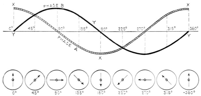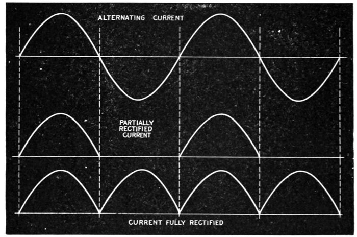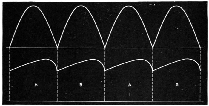 The action of the rectifier will be better understood by reference to the diagram of current waves and impressed pressure as shown in figs. 2,103 to 2,106.