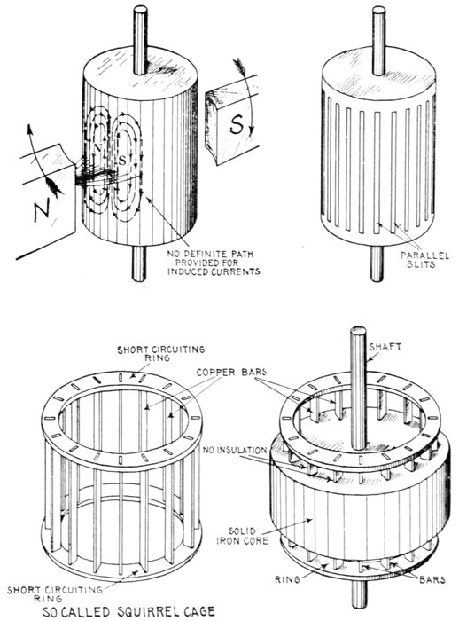| Classification—synchronous motors—essential parts—synchronous motor principles: condition for starting; effective pressure; dead centers; speed; limit of lag; effect of load changes—effect of altering the field strength—disadvantages of synchronous motors; advantages—the "V" curve—adaptation—efficiency—hunting of synchronous motors; mechanical analogy—use as condenser—surging—characteristics of synchronous motors: starting; running; stopping; effect upon circuit; power factor; auxiliary apparatus; adaptation—induction (asynchronous) motors—essential parts—types—oscillating magnetic field—rotating magnetic field—operation of single phase motor; why not self starting; provision for starting—operation of polyphase induction motor; why called asynchronous—speed; classification according to speed—the terms primary and secondary—why polyphase induction motors are explained before single phase—polyphase induction motors—features—essential parts—principles—production of rotating field—Tesla's rotating field—method of obtaining resultant flux of Tesla's field—Arago's rotations; explanation—Faraday's experiment—production of two phase rotating field; resultant poles—six and eight pole two phase rotating fields—physical conception of two phase rotating field—production of three phase rotating field; with ring winding—physical conception of three phase rotating field—three phase six pole winding—slip—copper cylinder illustrating principle of operation of induction motor—calculation of slip—table of synchronous speeds—variation of slip; why so small; variation with load; table of variation—sector method of measuring slip—evolution of [Pg iv]the squirrel cage armature; construction—the field magnets; parts; construction—field windings for induction motors—calculation for revolutions of rotating field; objection to high speed of field—difficulty with low frequency currents—general character of field winding—formation of poles—grouping of coils—starting of induction motors: external resistance, auto-transformer, internal resistance methods—internal resistance induction motors; adaptation—how resistance is cut out—why not desirable for large sizes—external resistance or slip ring motors—operation—armature connections—single phase induction motors—service suitable for—disadvantage—parts—why not self-starting—how started—phase splitting; production of rotating field from oscillating field—methods—starting coils—shading coils—character of the starting torque—modification of armature for starting with heavy load—clutch type of single phase induction motor; its action in starting—commutator motors—classification—action of closed coil rotating in alternating field—the transformer pressure—generated pressure—self-induction pressure—local armature currents; reason for sparking; how reduced—high resistance connectors—effect of low power factor—effect of frequency—series motor—features—adaptation—neutralized series motor—conductive method—inductive method—shunt motors—repulsion motors—difficulty with early motors—means employed to stop sparking—essentials of single repulsion motors—the term repulsion induction motor—compensated repulsion motor—power factor of induction motors—its importance—false ideas in regard to power factor—speed and torque of motors. | |