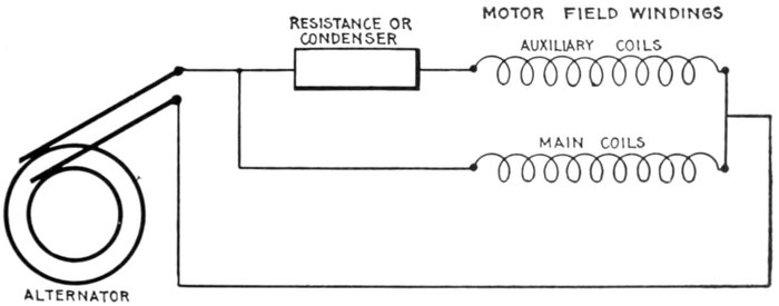 Any single or polyphase alternator will operate as a synchronous motor when supplied with current at the same pressure and frequency as it produces as a generator, the essential condition, in the case of a single phase machine, being that it be speeded up to so called synchronism before being put in the circuit.