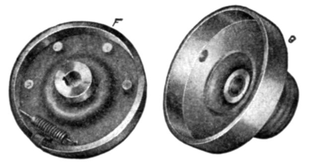 CP is flexibly connected through F to one of the direct current terminals T, to which also are joined up one coating of each condenser K and K'.