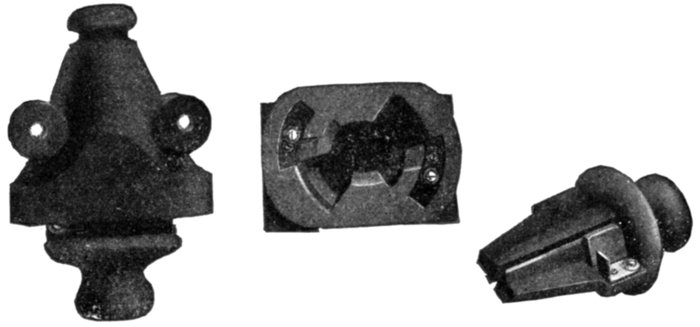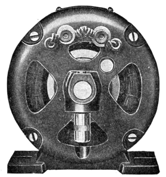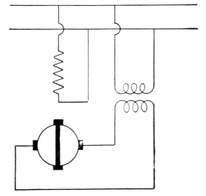 [12]Electro-magnetic Rectifiers.—Devices of this class consist essentially of a double contact rocker which rocks on pivot (midway between the contacts), in synchronism with the frequency of the alternating current, so changing the connections at the instants of reversals of the alternating current that a direct current is obtained.