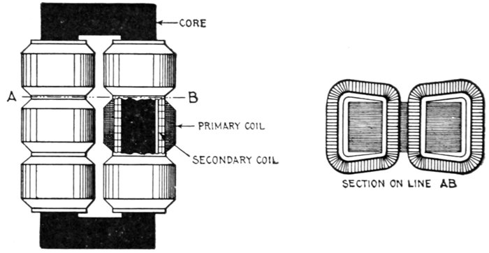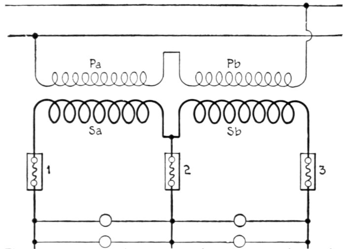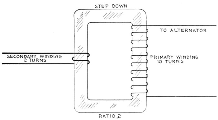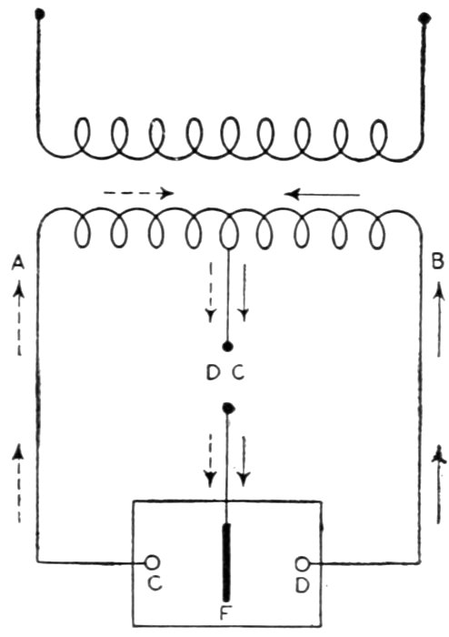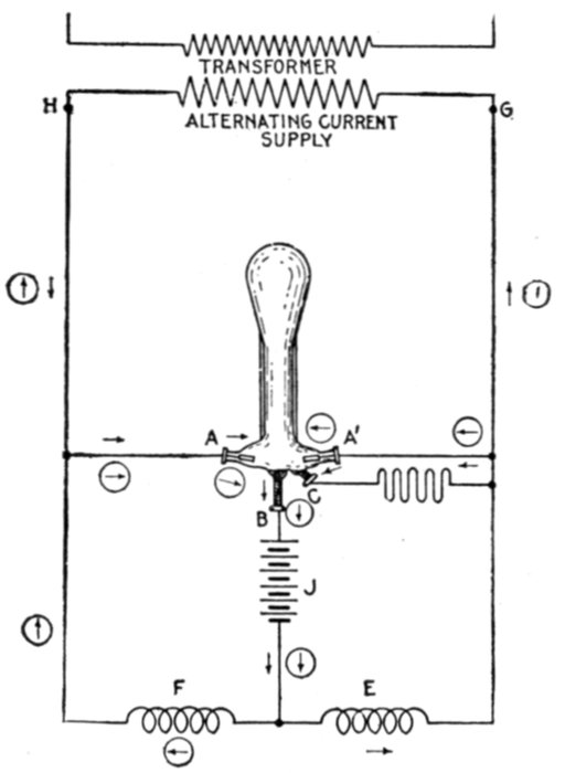 Ans. Fig. 2,108 is an elementary diagram of connections. The rectifier tube is an exhausted glass vessel in which are two graphite anodes A, A', and one mercury cathode B. The small starting electrode C is connected to one side of the alternating circuit, through resistance; and by rocking the tube a slight arc is formed, which starts the operation of the rectifier tube. At the instant the terminal H of the supply transformer is positive, the anode A is then positive, and the arc is free to flow between A and B. Following the direction of the arrow still further, the [Pg 1518]current passes through the battery J, through one-half of the main reactance coil E, and back to the negative terminal G of the transformer. When the impressed voltage falls below a value sufficient to maintain the arc against the reverse pressure of the arc and load, the reactance E, which heretofore has been charging, now discharges, the discharge current being in the same direction as formerly. This serves to maintain the arc in the rectifier tube until the pressure of the supply has passed through zero, reversed, and built up such a value as to cause the anode A to have a sufficiently positive value to start the arc between it and the cathode B. The discharge circuit of the reactance coil E is now through the arc A'B instead of through its former circuit. Consequently the arc A'B is now supplied with current, partly from the transformer, and partly from the reactance coil E. The new circuit from the transformer is indicated by the arrows enclosed in circles.