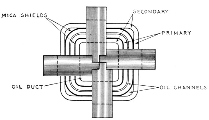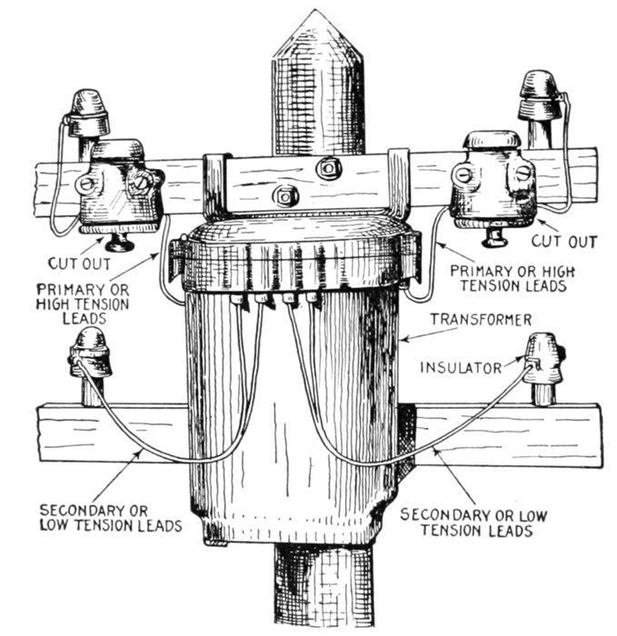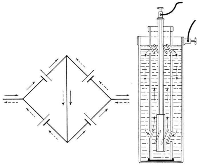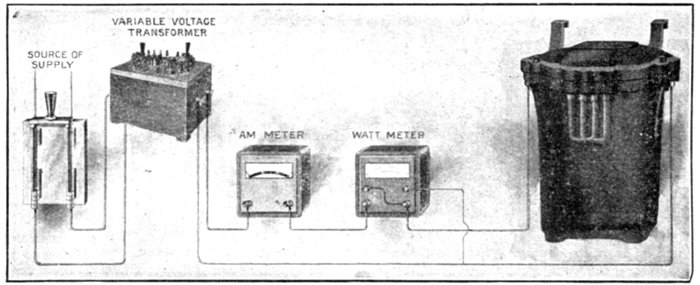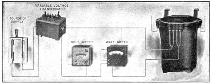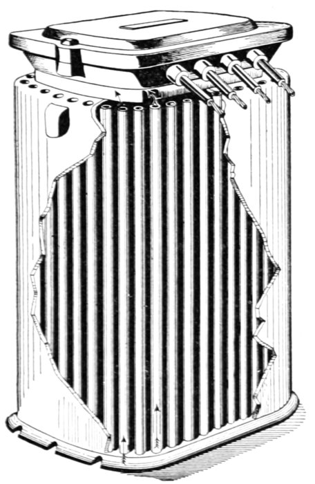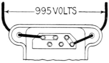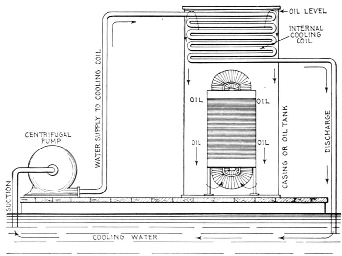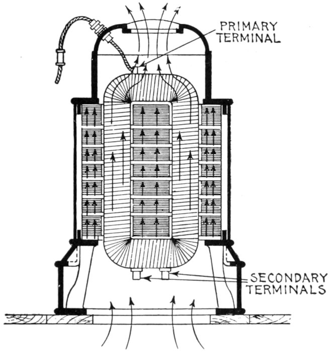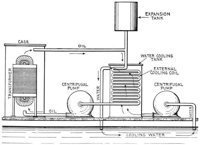 Ans. In small rectifier sets the heat generated is dissipated through the tube to the air, and in large tubes such as used in supplying 40 to 60 kw. for constant current flaming arc lights operating at 4 or 6.6 amperes, the tubes are immersed in a[Pg 1525] tank of oil, and cooled similar to the arrangement used for oil insulated water cooled transformers.