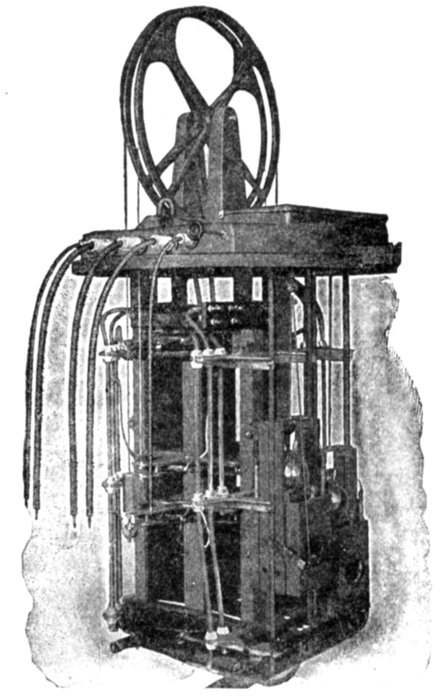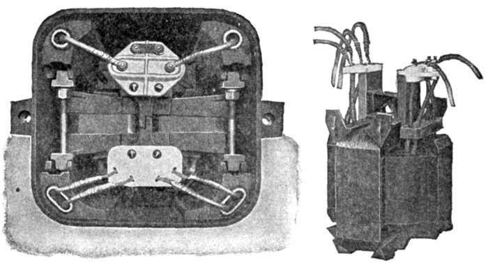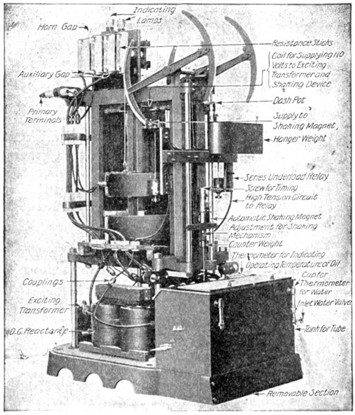 Fig. 2,102.—General Electric 2,200 volts, 60 cycle, primary, 6.6 ampere, secondary, 75 light, double tube mercury arc rectifier outfit with automatic shaking device, the case being removed to show parts. The constant current transformer is air cooled. The winding which supplies energy for the exciter transformer is located at the top of, and around the core of the constant current transformer. The exciting transformer is mounted on the base of the constant current transformer inside of the casing. It supplies low pressure currents to the starting anodes of the rectifier tube. This current establishes an auxiliary arc when the tube is shaken, which is necessary in order to start the rectifier. The exciting transformer is wound for 110 volts and it consumes about 200 volt-amperes. The direct current reactance is mounted on the base of the transformer and enclosed in the same casing. It is connected in series with the lamp load and its function is to reduce the pulsations of the circuit to a value most satisfactory for operation. The tube tank for holding the oil is mounted on the same base as the transformer. It is provided with a cooling coil; a tube carrier is provided for raising or lowering the tube in the tank. A thermometer is provided to gauge the temperature of the oil in the tank. The static dischargers consisting of horn gaps in series with resistance, are connected between the anodes and the cathode in order to protect the tubes and other apparatus from excessive electrical strains. The horn gaps open the circuit after discharge, and in case the resistance becomes damaged the discharge passes across the spark gap provided, thereby shunting the resistance.