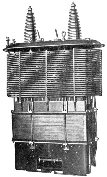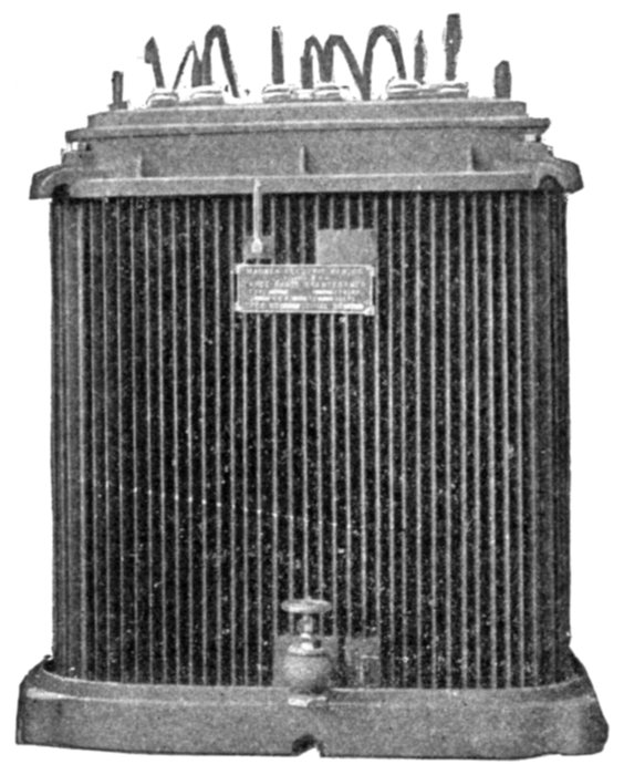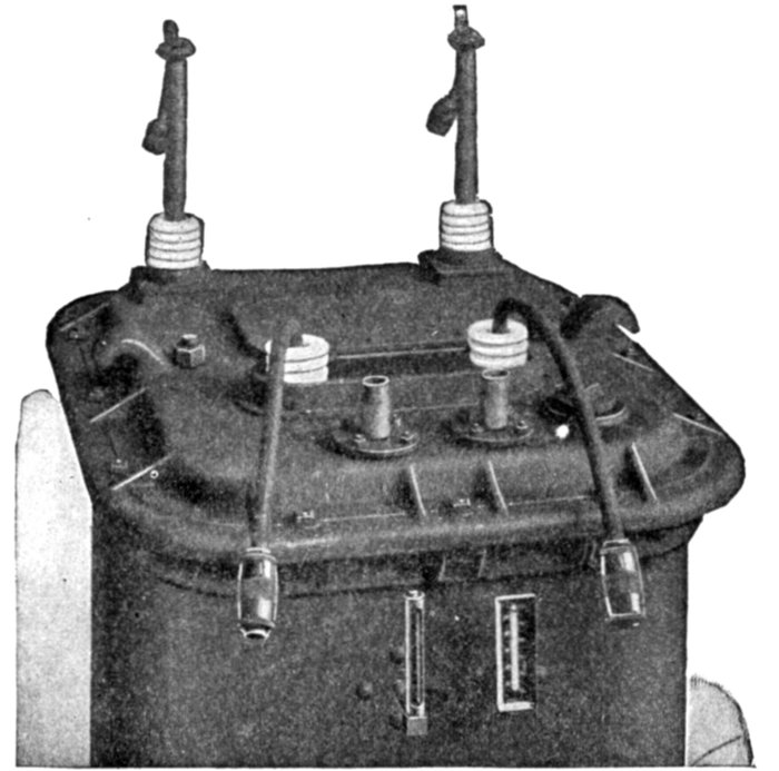 Fig. 2,101.—General Electric 50 light double tube combined unit series mercury arc rectifier outfit; front view. This unit consists of a constant current transformer, reactance, tube tank and exciting transformer mounted on a common base; also a static discharger and pilot lamp mounted on top of the transformer. This arrangement makes the rectifier outfit, with the exception of the switchboard panel, complete in itself.