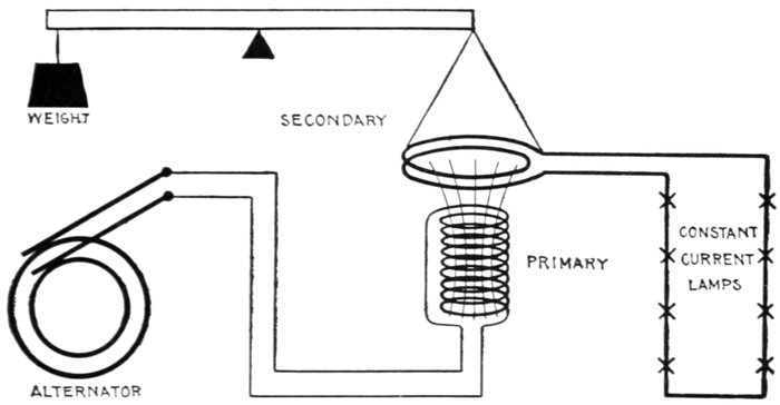 Owing to the direct current in the magnetizing coils C and C' one end of SB will be permanently of north and the other of south polarity; and since the polarities of the poles E and E' will alternate with the alternations of the transformer secondary current, SB will rock rapidly on its pivot, and contact will be made by turns with CS and CS'.