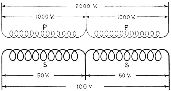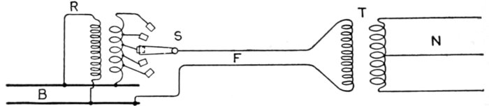The other direct current terminal T' is connected to the center of the transformer secondary at t; and CS and CS' are respectively joined up to either end of the secondary winding and to the other coatings of the condensers.