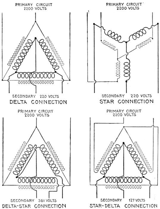 | Their use—essential parts—basic principles—the primary winding—the secondary winding—magnetic leakage—the induced voltage—no load current—magnetizing current—action of transformer with load—classification—step up transformers—use—construction—copper economy—step down transformers—use—construction—core transformers—construction—advantages—shell transformers—comparison of core and shell types—choice—combined core and shell transformers—economy of construction—single and polyphase transformers—features of each type—choice of types for polyphase currents—operation of three phase transformer with one phase damaged[Pg v]—transformer losses—hysteresis—what governs the loss—how reduced—eddy currents—lamination—thickness of laminæ—importance of iron losses—how to reduce iron losses—copper losses—how caused—effect on power factor—effect of resistance—cooling of transformers—cooling mediums employed—heating of transformers—objection to heating—dry transformers—air cooled transformers—natural draught type—forced draught or air blast type—construction of coils for air cooling—requirements with respect to air supply—quantity of air used—oil cooled transformers—circulation of the oil—action of the oil—objection to oil—kind of oil used—oil requirements—moisture in oil—water cooled transformers—internal coil type—external coil type—thermo-circulation—quantity of circulating water required—transformer insulation—the "major" and "minor" insulation—mica—outdoor transformers for irrigation service—oil insulated transformers—efficiency of transformers—efficiency curve—all day efficiency of transformers—transformer fuse blocks—auto-transformers—constant current transformers for series arc lighting; elementary diagram illustrating principles—regulation—transformer connections—single phase connections—combining transformers—precautions—operating secondaries in parallel—connections for different voltages—precautions—two phase connections—three phase connections: delta, star, delta star, star-delta—comparison of star and delta connections—three phase transformers—comparison of air blast, water cooled, and oil cooled transformers—standard transformer connections—how to test transformers—transformer operation with grounded secondary—transformer capacity for motors—transformer connections for motors—arc lamp transformer—transformer installed on pole—static booster or regulating transformer. | |