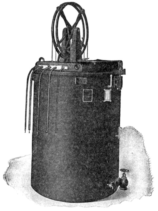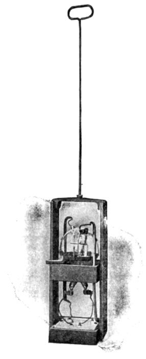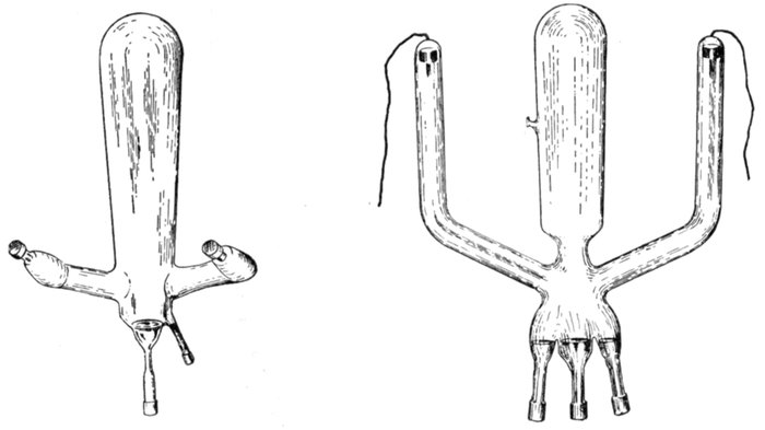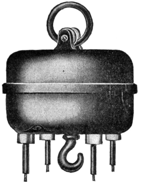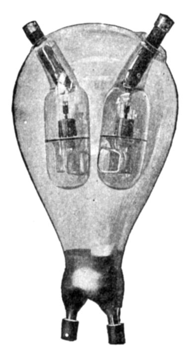 Fig. 2,107.—General Electrical rectifier tube as used on series mercury arc rectifier. The tube rectifies the alternating current into direct current. It consists of an exhausted glass vessel containing one anode or positive terminal in each of the two upper arms, two mercury starting anodes and a cathode or negative terminal of mercury at the bottom of the tube. It is submerged in oil and supported in a removable carrier. The tube is put into operation by slightly shaking it. In the combined unit set, this shaking is accomplished by an electromagnet mounted above the tube tank and operated from a pull button switch on the panel. An automatic shaker is sometimes installed which will automatically start the tube when the set is started, or if its operation should become interrupted while in service. The energy for the operation of this magnet (110 volts alternating current) is obtained from the small auxiliary winding on the main transformer which also supplies energy to the exciting transformer. The oil in which the tube is placed is cooled by a circulation of water through the cooling coils on the inside of the tube tank. The amount of water necessary for cooling the rectifier tubes varies according to local conditions, depending upon the temperature of the water and that of the air in the station but under the most favorable conditions no water is required. As rectifiers are commonly installed in steam driven stations, the drip from the tube tanks is usually piped to the boiler supply thereby eliminating any loss for cooling water.