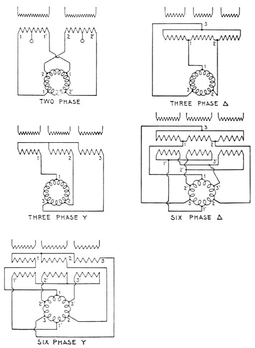 | Where used—kinds of converter—A.I.E.E. classification—rotary converters—operation—speed—principles—relation between input and output pressures—single and polyphase types—advantage of polyphase converters—armature connections of polyphase converter—pressure relation—voltage variation—advantage of unity power factor—effect of field too strong—compounding of rotary converters—[Pg vi]ratio of conversion—voltage regulation—split pole method—regulating pole method—best location of regulating poles—reactance method—multi-tap transformer method—synchronous booster method—winding connections—field connections—adaptation—motor generator sets—classification—standard practice—behavior of rotary when hunting; comparison with motor generator sets—racing—frequency changing sets—parallel operation of frequency changers—cascade converter—speed—action in motor armature winding—advantages—how started—comparison of cascade converter with synchronous converter. | |