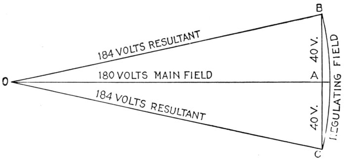 Figs. 1,605 to 1,608.—Synchronous motor principles: VIII. If the torque and current through the motor armature be kept constant, strengthening the field will increase the mechanical lag, and the lead of the current with respect to the reverse pressure. In the figures, let A be an instantaneous position of the alternator coil, A°, synchronous position of motor coil, A', position corresponding to current phase, A", actual position or mechanical lag of motor coil behind alternator coil necessary to maintain equilibrium. In fig. 1,606, let A' and A" represent respectively the relation of current phase and mechanical lag corresponding to a certain load and field strength. For these conditions OG, O'G', O"G", etc., will represent the components of the induced lines of force in opposition to the motor field, that is, they indicate the intensity of the armature reaction at the instant depicted. Now, assume the field strength to be doubled, as in fig. 1,608, the motor load and current being maintained constant. Under these conditions, the armature reaction must be doubled to maintain equilibrium; that is, the components OG, O'G', etc., fig. 1,608, must be twice the length of OG, O'G', etc., fig. 1,605. Also since the current is maintained constant, the induced magnetic lines OF, O'F' are of same length in both figures. Hence, in fig. 1,608 the plane of these components is such that their extremities touch perpendiculars from G, G', etc., giving the other components FG, F'G', etc. The plane A', normal to OF, O'F', etc., gives the current phase. By construction, the phase difference between A° and A' is such that sin A°OA' (fig. 1,608) = 2 × sin A°OA' (fig. 1,606). That is, doubling the field strength causes an increase of current lag such that the sine of the angle of this lag is doubled. Since the intensity of the armature reaction depends on the lead of the current with respect to the reverse pressure, the mechanical lag of the coil must be increased to some position as A" (fig. 1,608), such as will give an armature reaction of an intensity indicated by the components OG, O'G', etc.