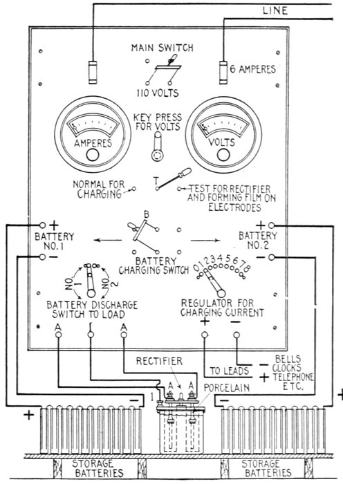 Ans. A rectifier outfit with its starting devices, etc., is shown in figs. 2,114 to 2,116. To start the rectifier, close in order named line switch and circuit breaker; hold the starting switch in opposite position from normal; rock the tube gently by rectifier shaker. When the tube starts, as shown by greenish blue light, release[Pg 1522] starting switch and see that it goes back to normal position. Adjust the charging current by means of fine regulation switch on the left; or, if not sufficient, by one button of coarse regulation switch on the right. The regulating switch may have to be adjusted occasionally during charge, if it be desired to maintain charging amperes approximately constant.