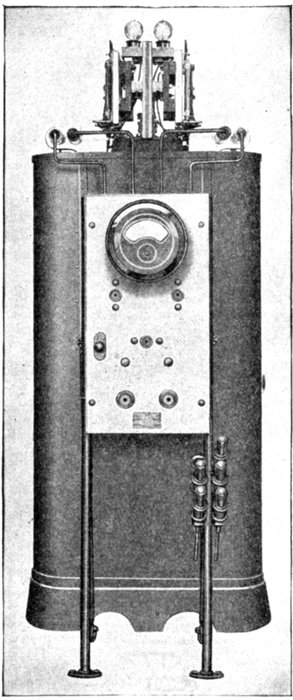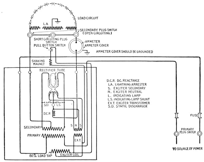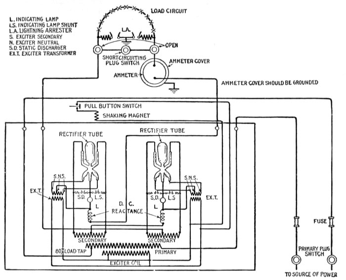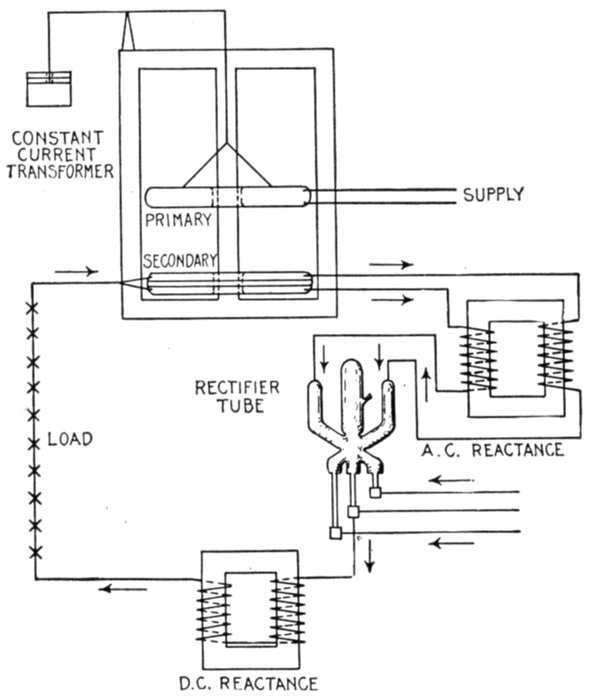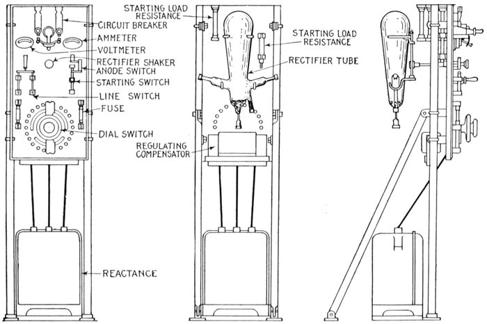 Ans. It consists of a constant current regulating transformer,[Pg 1516] a rectifier bulb, and a control panel containing the necessary switches, meters, etc. The transformer and rectifier bulb are mounted in the same tank.