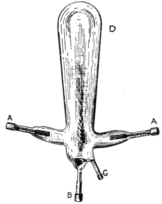 Fig. 2,120.—General Electric 100 volt mercury arc rectifier tube. A,A, anodes; B, cathode; C, starting anode; D, tube or bulb.