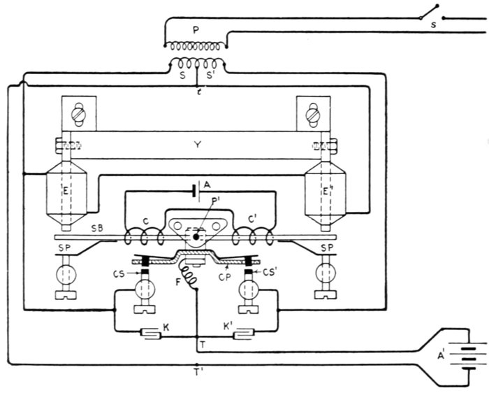 S and S' is the secondary winding of the transformer, with a tapping t midway, joining it to a series circuit containing two alternating current electromagnets E and E', whose cores are connected by the long soft iron yoke Y. Pivoted at P' is a steel bar SB, which is polarized by the two coils C and C' the current being supplied by a cell A. Fixed[Pg 1528] rigidly to SB, and moving with it, is a double contact piece CP with platinum contacts opposite similar ones on the fixed studs CS, CS'.