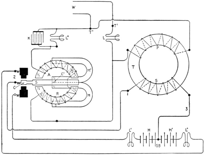 Fig. 2,122.—Diagram of General Electric (Batten) electromagnetic rectifier. It is desirable for light and occasional service, where direct current is required but only an alternating supply is available, being used for charging storage batteries, exciting spark coils, performing electrolytic work, etc. The rectifier consists of a step down static transformer T, by means of which the circuit pressure is reduced to about 50 volts; also, a polarized relay R, the contact tongue C of which moves to one side or the other in sympathy with the alternations of the current in the primary winding P, the secondary current induced in the winding S being thereby rendered direct in the outer circuit. T', T' are the main terminals which are connected to the alternating current supply through the wires W. Lamps inserted at L are used as resistances in the primary circuit, the reduction of the voltage already alluded to being effected by this means. In charging storage batteries where a low pressure is required, a lamp (or lamps) should be connected in the secondary circuit as shown, S B being the storage battery, and L' L' the lamp resistances in series therewith, the battery has one end of the secondary S connected to its middle. Thus the alternating current leaving the transformer by the wire 1, passes by flexible connection 2, to the vibrating contact tongue C of the relay, the latter causing the currents in either direction to flow through the two halves H, H' of the battery, whence the current re-enters the secondary of the transformer by the wire 3. The soft iron core of the relay is in two halves S' S' and the armature A, carrying C, vibrates between their polar extremities. M, M' are two permanent magnets with their like poles together at the center C' where A is pivoted. Supposing these poles are north as indicated, the extremities of A will be south. The south ends of M, M being in juxtaposition with the centers of the soft iron cores S', S' will render their extremities facing the ends of A of north polarity. The windings on S', S' are connected in series with each other, and in shunt with P across the main terminals T', T'. Then because of the polarization of A and S', S', the former will vibrate rapidly in sympathy with the alternations of the current. K is a condenser shunted by a lamp resistance L", this being found to improve the working of R.